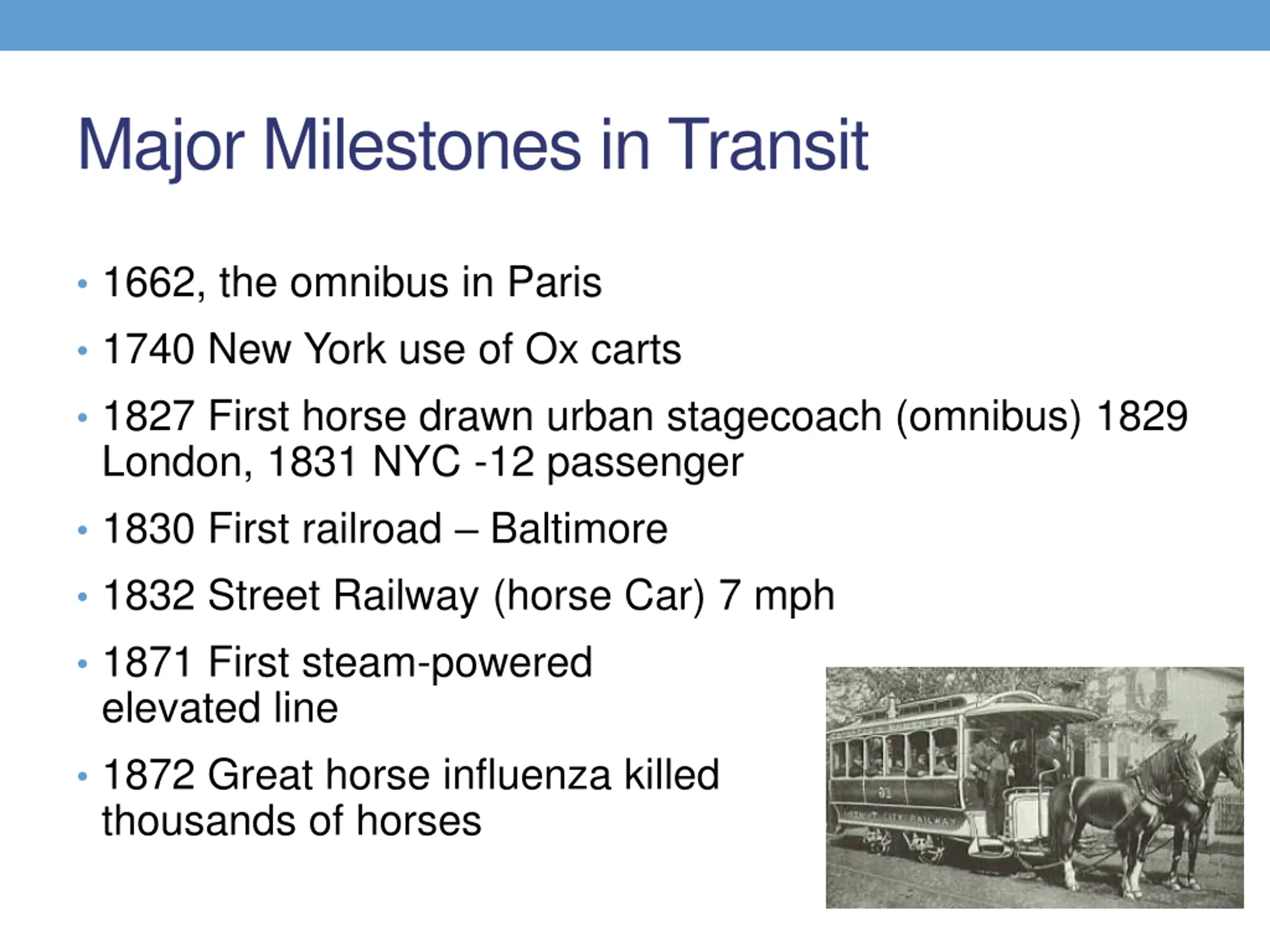 Major Milestones in Transit 1662, the omnibus in Paris 1740 New York use of Ox carts 1827 First horse drawn urban stagecoach (omnibus) 1829 London, 1831 NYC -12 passenger 1830 First railroad Baltimore 1832 Street Railway (horse Car) 7 mph 1871 First steam-powered elevated line 1872 Great horse influenza killed thousands of horses