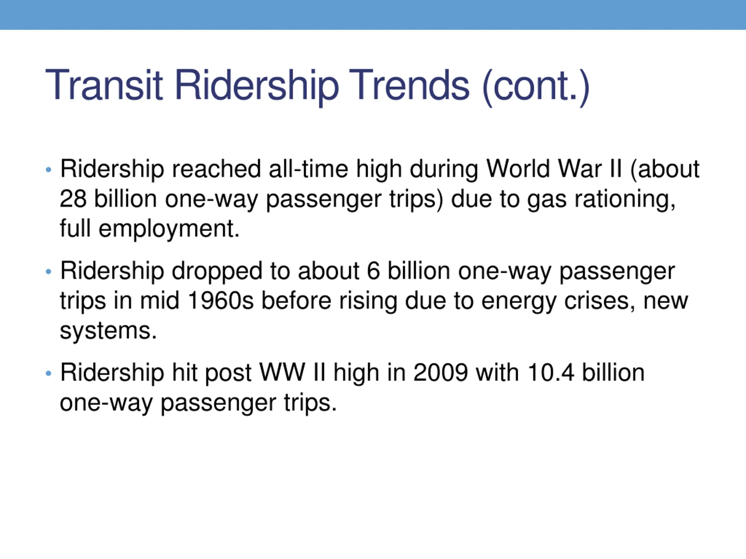 Transit Ridership Trends (cont.) Ridership reached all-time high during World War II (about 28 billion one-way passenger trips) due to gas rationing, full employment. Ridership dropped to about 6 billion one-way passenger trips in mid 1960s before rising due to energy crises, new systems. Ridership hit post WW II high in 2009 with 10.4 billion one-way passenger trips.
