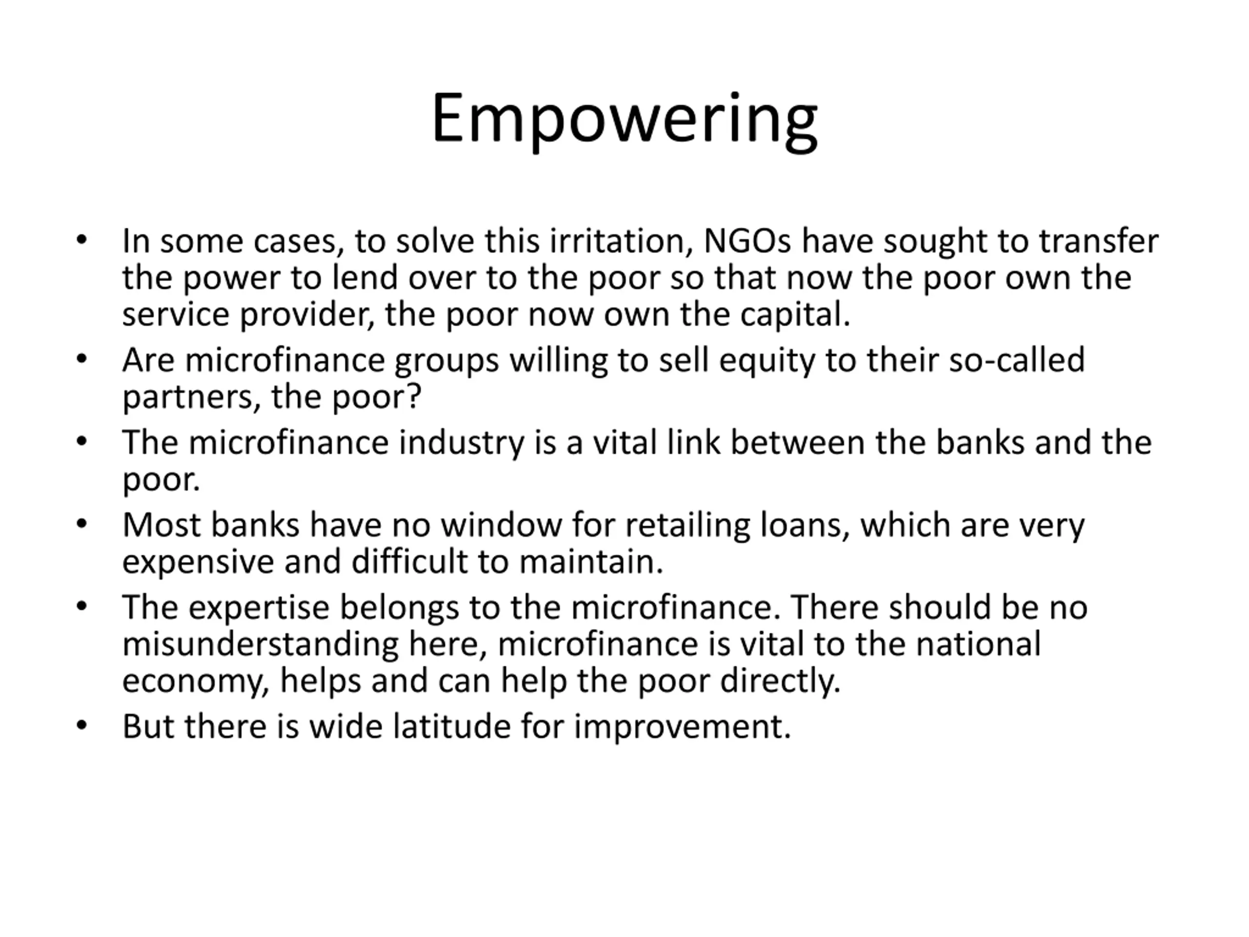 Empowering In some cases, to solve this irritation, NGOs have sought to transfer the power to lend over to the poor so that now the poor own the service provider, the poor now own the capital. Are microfinance groups willing to sell equity to their so-called partners, the poor? The microfinance industry is a vital link between the banks and the poor. Most banks have no window for retailing loans, which are very expensive and difficult to maintain. The expertise belongs to the microfinance. There should be no misunderstanding here, microfinance is vital to the national economy, helps and can help the poor directly. But there is wide latitude for improvement.
