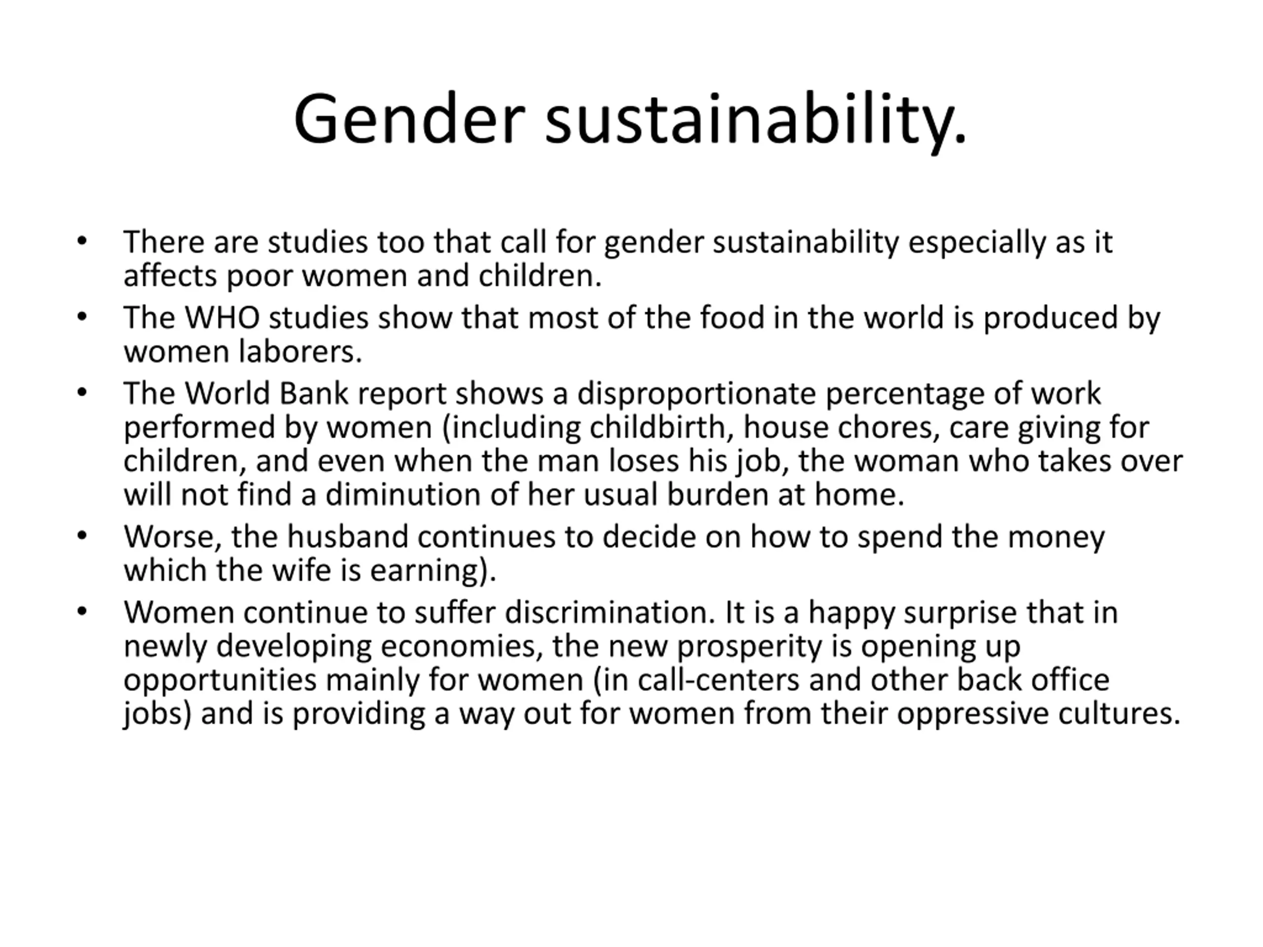 Gender sustainability. There are studies too that call for gender sustainability especially as it affects poor women and children. The WHO studies show that most of the food in the world is produced by women laborers. The World Bank report shows a disproportionate percentage of work performed by women (including childbirth, house chores, care giving for children, and even when the man loses his job, the woman who takes over will not find a diminution of her usual burden at home. Worse, the husband continues to decide on how to spend the money which the wife is earning). Women continue to suffer discrimination. It is a happy surprise that in newly developing economies, the new prosperity is opening up opportunities mainly for women (in call-centers and other back office jobs) and is providing a way out for women from their oppressive cultures.