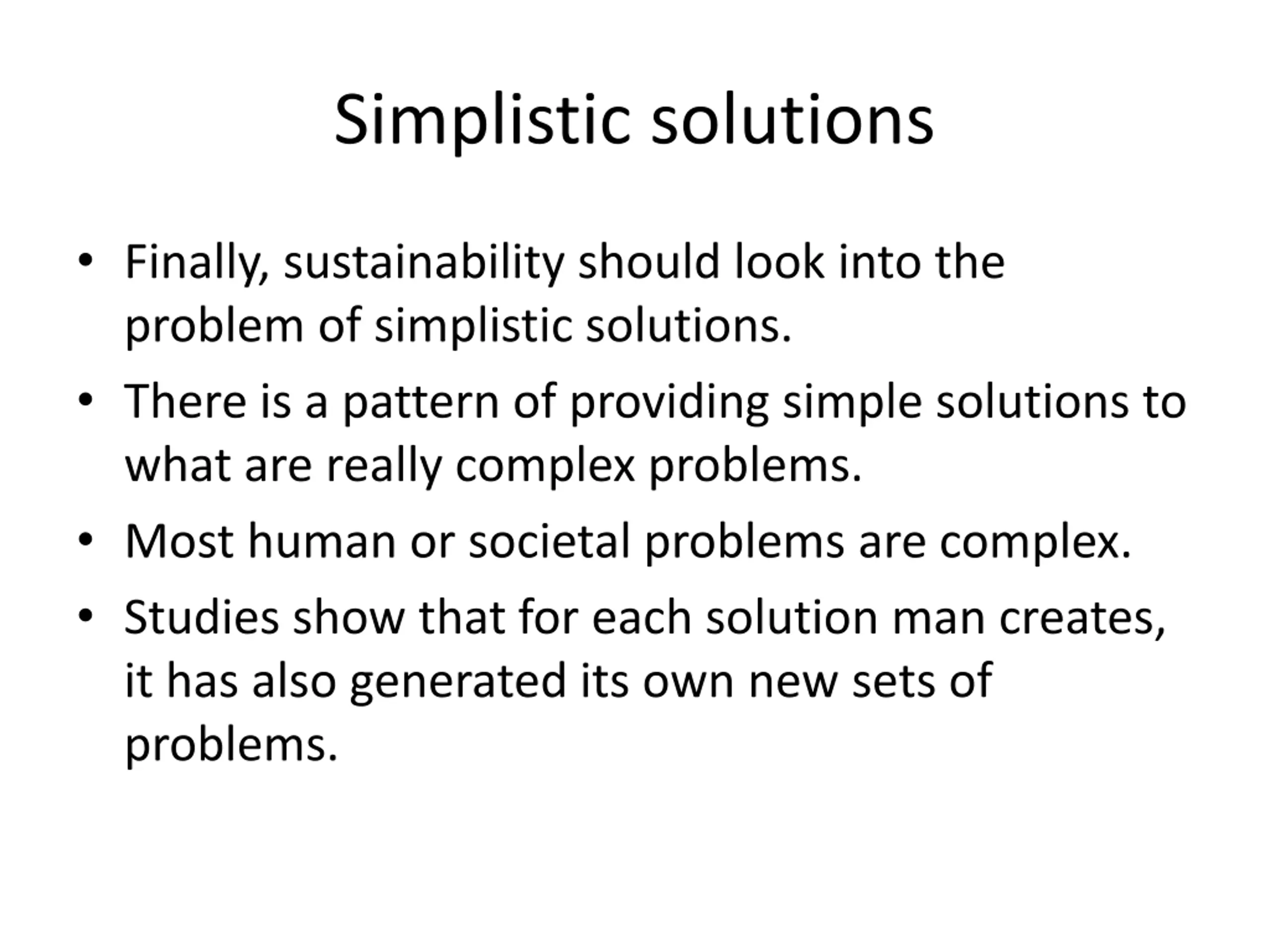 Simplistic solutions Finally, sustainability should look into the problem of simplistic solutions. There is a pattern of providing simple solutions to what are really complex problems. Most human or societal problems are complex. Studies show that for each solution man creates, it has also generated its own new sets of problems.