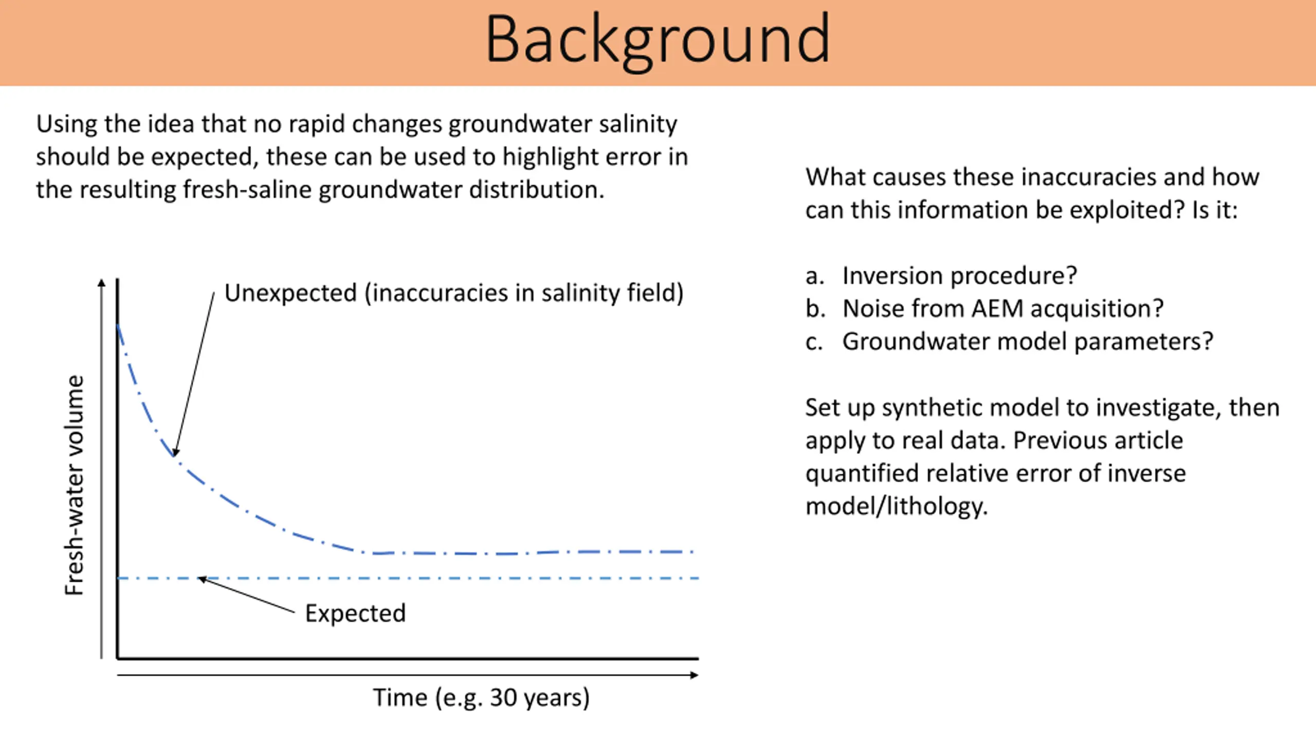 Background Using the idea that no rapid changes groundwater salinity should be expected, these can be used to highlight error in the resulting fresh-saline groundwater distribution. What causes these inaccuracies and how can this information be exploited? Is it: a. Inversion procedure? b. Noise from AEM acquisition? c. Groundwater model parameters? Unexpected (inaccuracies in salinity field) Fresh-water volume Set up synthetic model to investigate, then apply to real data. Previous article quantified relative error of inverse model/lithology. Expected Time (e.g. 30 years)