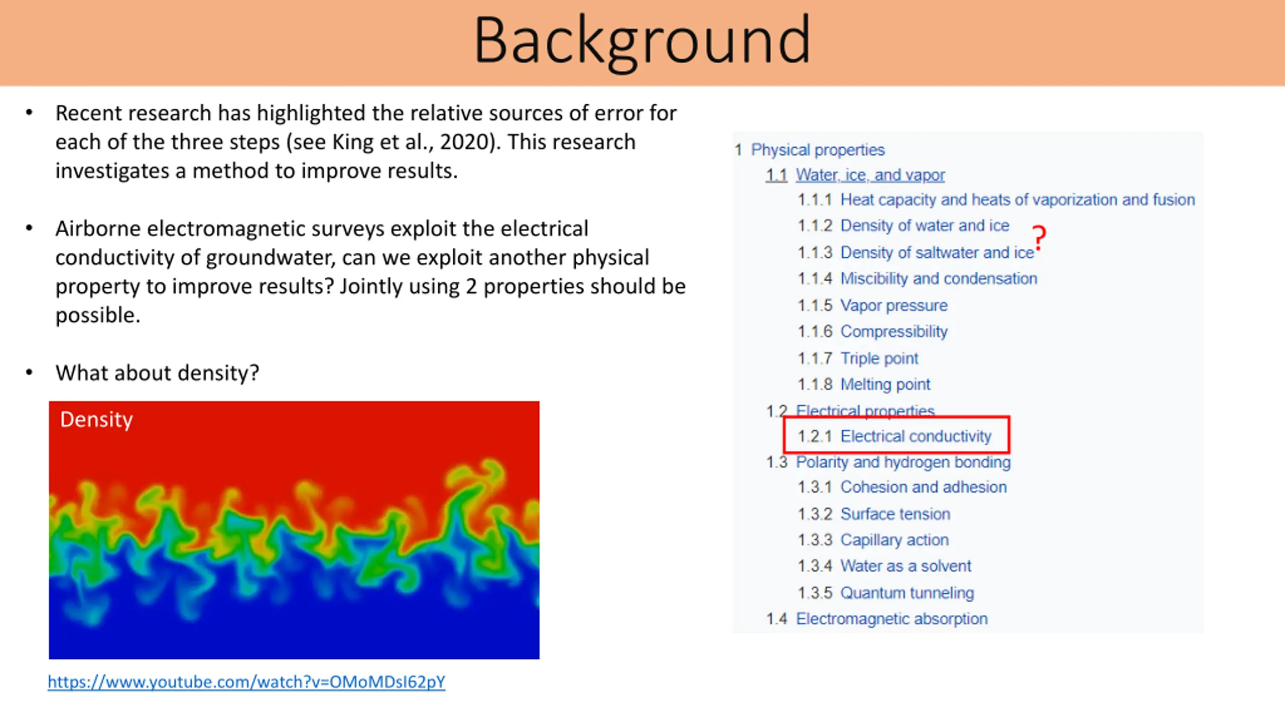 Background Recent research has highlighted the relative sources of error for each of the three steps (see King et al., 2020). This research investigates a method to improve results. Airborne electromagnetic surveys exploit the electrical conductivity of groundwater, can we exploit another physical property to improve results? Jointly using 2 properties should be possible. ? What about density? Density https://www.youtube.com/watch?v=OMoMDsI62pY