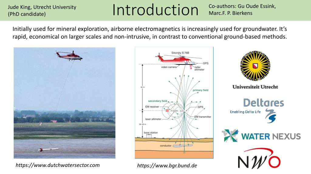 Introduction Co-authors: Gu Oude Essink, Marc.F. P. Bierkens Jude King, Utrecht University (PhD candidate) Initially used for mineral exploration, airborne electromagnetics is increasingly used for groundwater. It s rapid, economical on larger scales and non-intrusive, in contrast to conventional ground-based methods. https://www.dutchwatersector.com https://www.bgr.bund.de