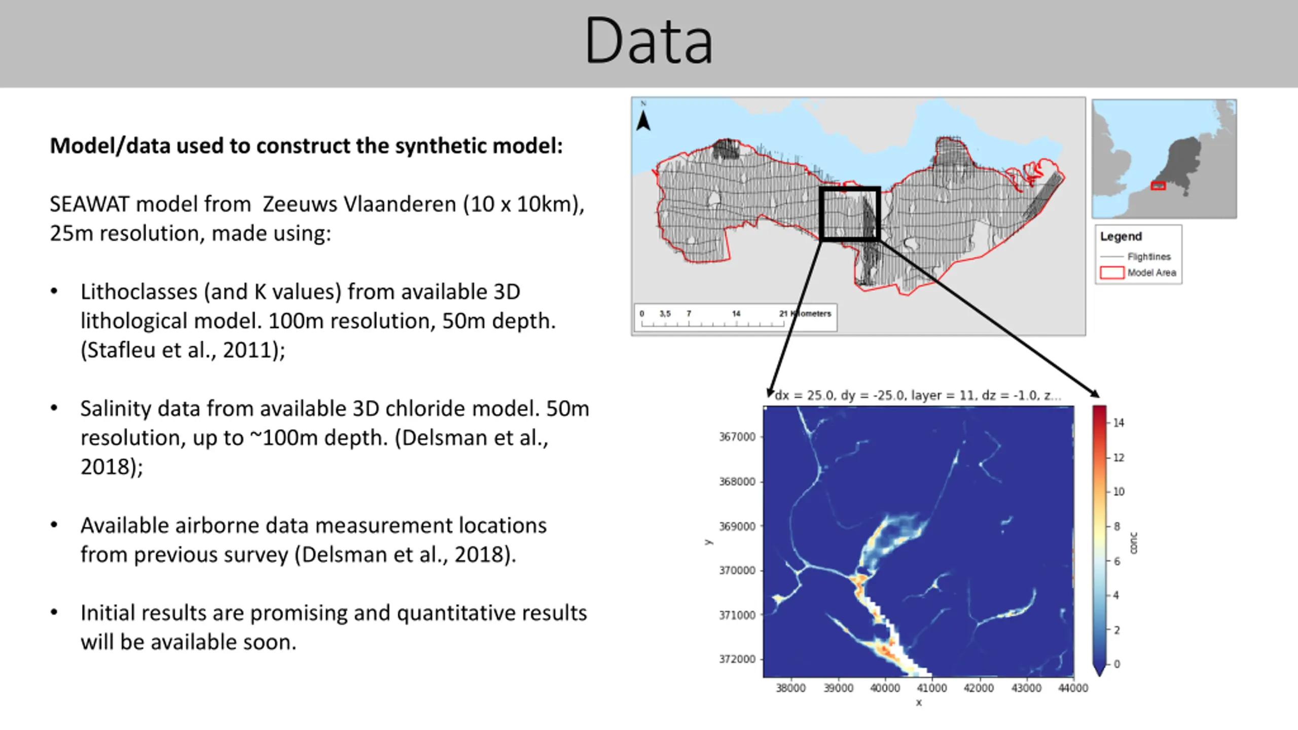 Reducing Error Data Model/data used to construct the synthetic model: SEAWAT model from Zeeuws Vlaanderen (10 x 10km), 25m resolution, made using: Lithoclasses (and K values) from available 3D lithological model. 100m resolution, 50m depth. (Stafleu et al., 2011); Salinity data from available 3D chloride model. 50m resolution, up to ~100m depth. (Delsman et al., 2018); Available airborne data measurement locations from previous survey (Delsman et al., 2018). Initial results are promising and quantitative results will be available soon.