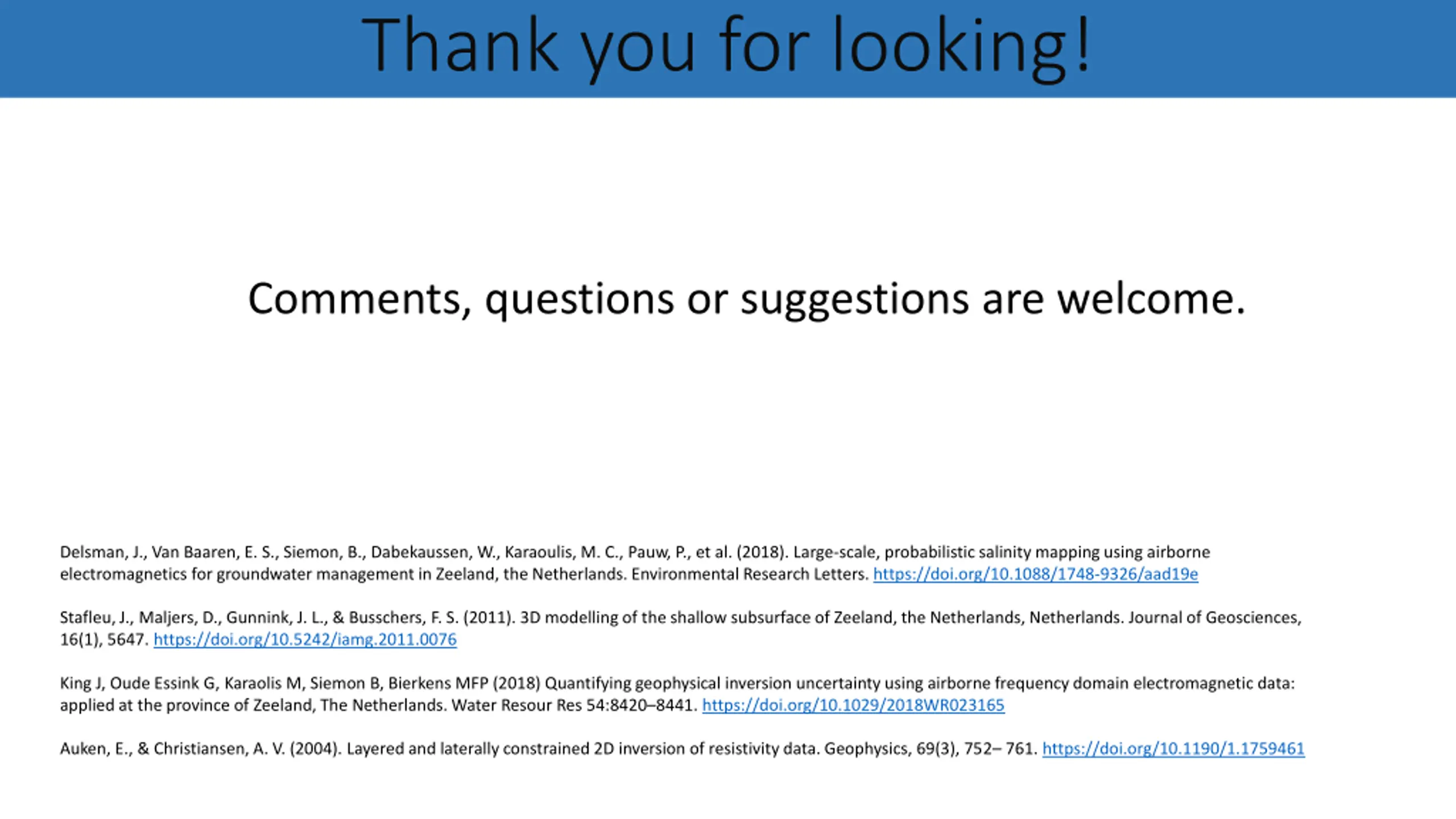 Thank you for looking! Comments, questions or suggestions are welcome. Delsman, J., Van Baaren, E. S., Siemon, B., Dabekaussen, W., Karaoulis, M. C., Pauw, P., et al. (2018). Large scale, probabilistic salinity mapping using airborne electromagnetics for groundwater management in Zeeland, the Netherlands. Environmental Research Letters. https://doi.org/10.1088/1748-9326/aad19e Stafleu, J., Maljers, D., Gunnink, J. L., & Busschers, F. S. (2011). 3D modelling of the shallow subsurface of Zeeland, the Netherlands, Netherlands. Journal of Geosciences, 16(1), 5647. https://doi.org/10.5242/iamg.2011.0076 King J, Oude Essink G, Karaolis M, Siemon B, Bierkens MFP (2018) Quantifying geophysical inversion uncertainty using airborne frequency domain electromagnetic data: applied at the province of Zeeland, The Netherlands. Water Resour Res 54:8420 8441. https://doi.org/10.1029/2018WR023165 Auken, E., & Christiansen, A. V. (2004). Layered and laterally constrained 2D inversion of resistivity data. Geophysics, 69(3), 752 761. https://doi.org/10.1190/1.1759461
