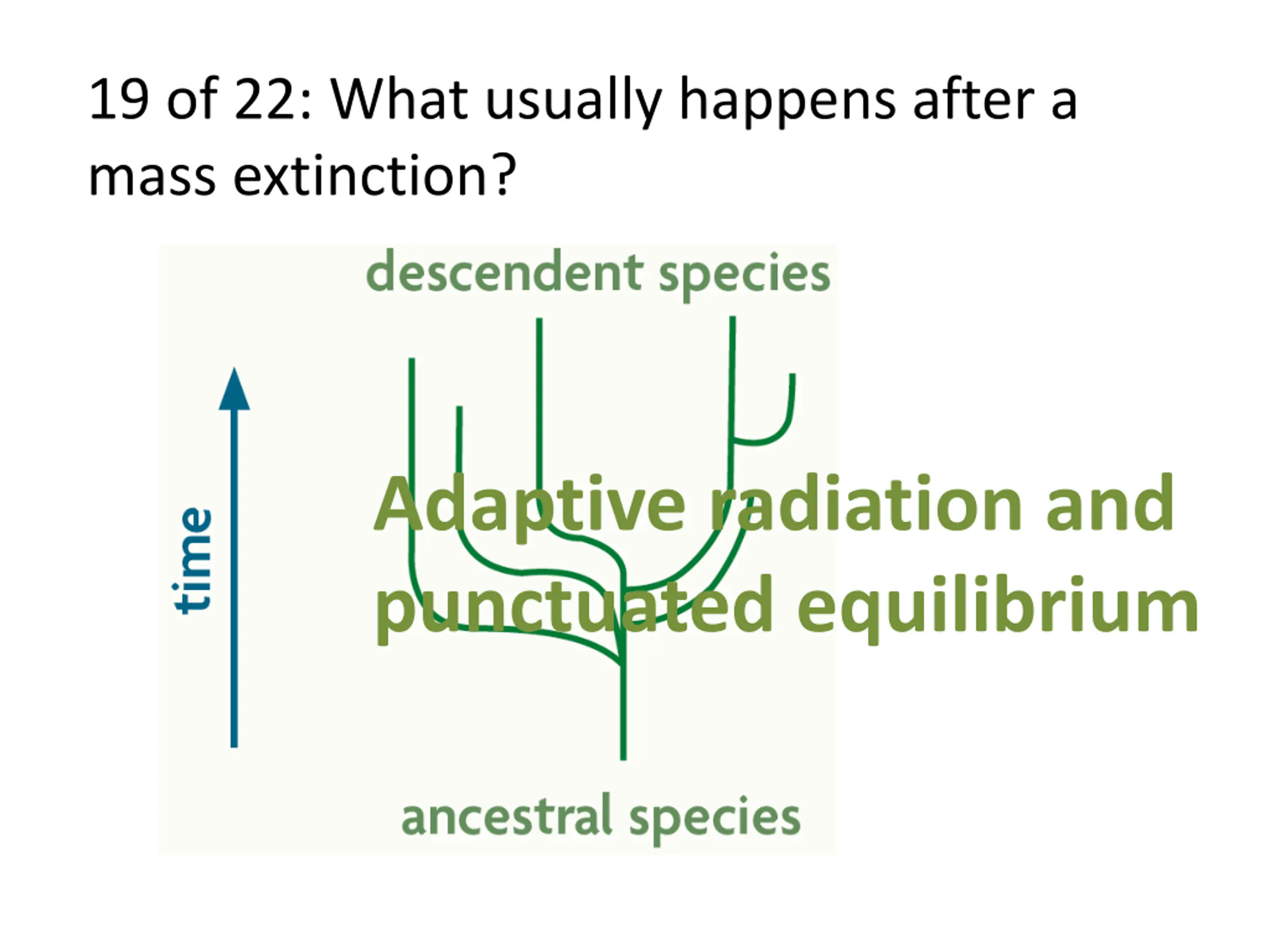 19 of 22: What usually happens after a mass extinction? Adaptive radiation and punctuated equilibrium