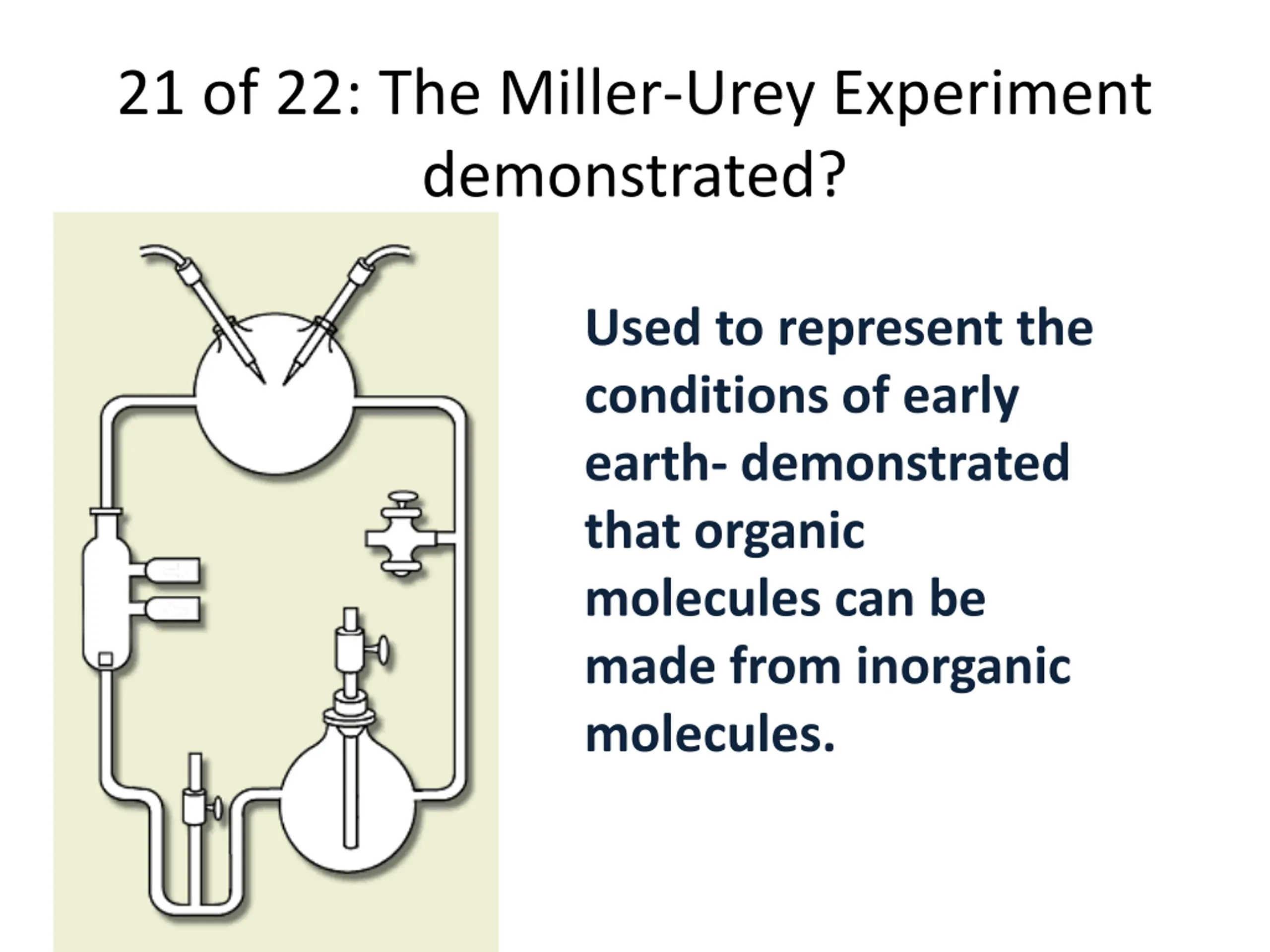 21 of 22: The Miller-Urey Experiment demonstrated? Used to represent the conditions of early earth- demonstrated that organic molecules can be made from inorganic molecules.