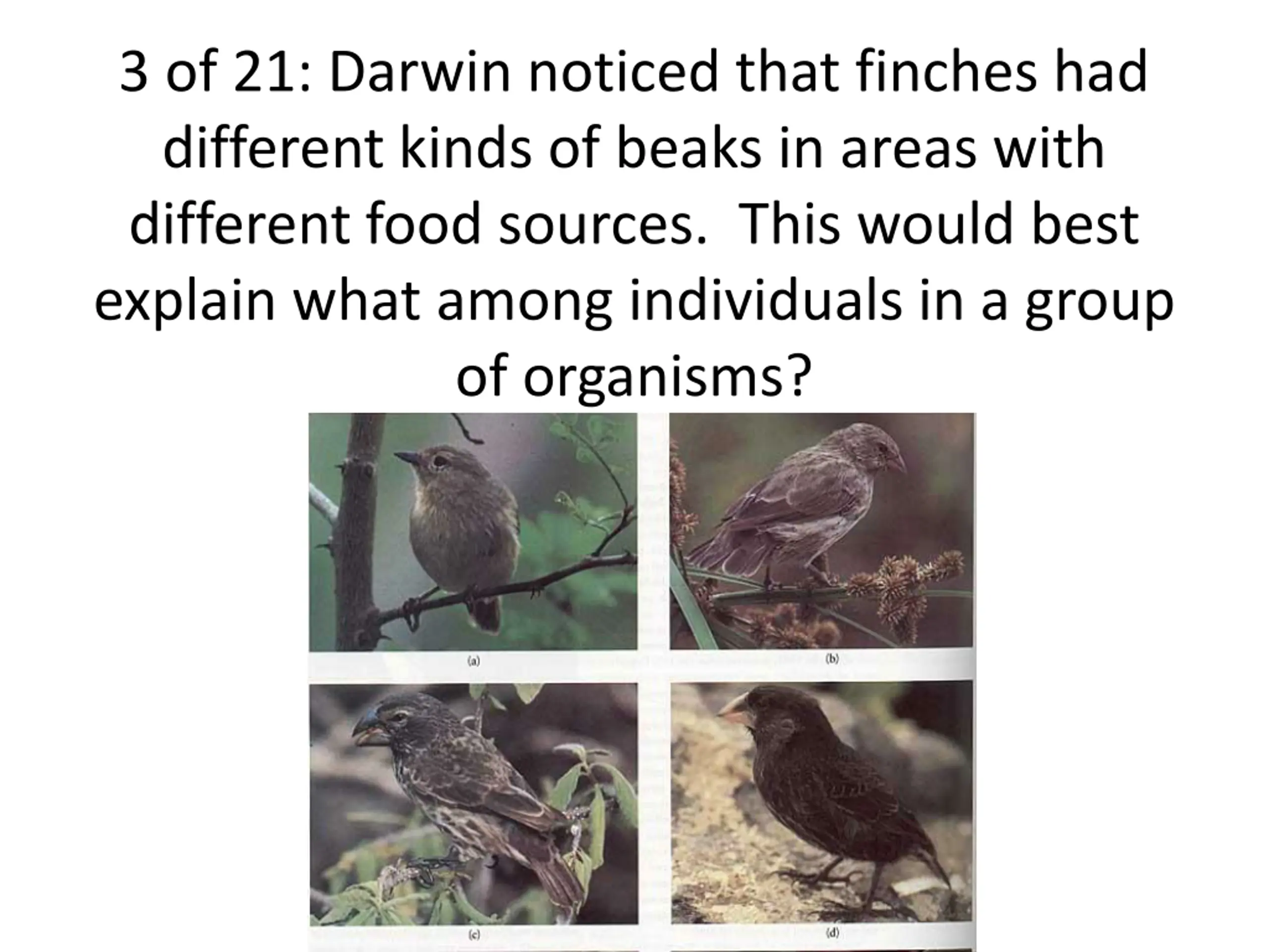 3 of 21: Darwin noticed that finches had different kinds of beaks in areas with different food sources. This would best explain what among individuals in a group of organisms?