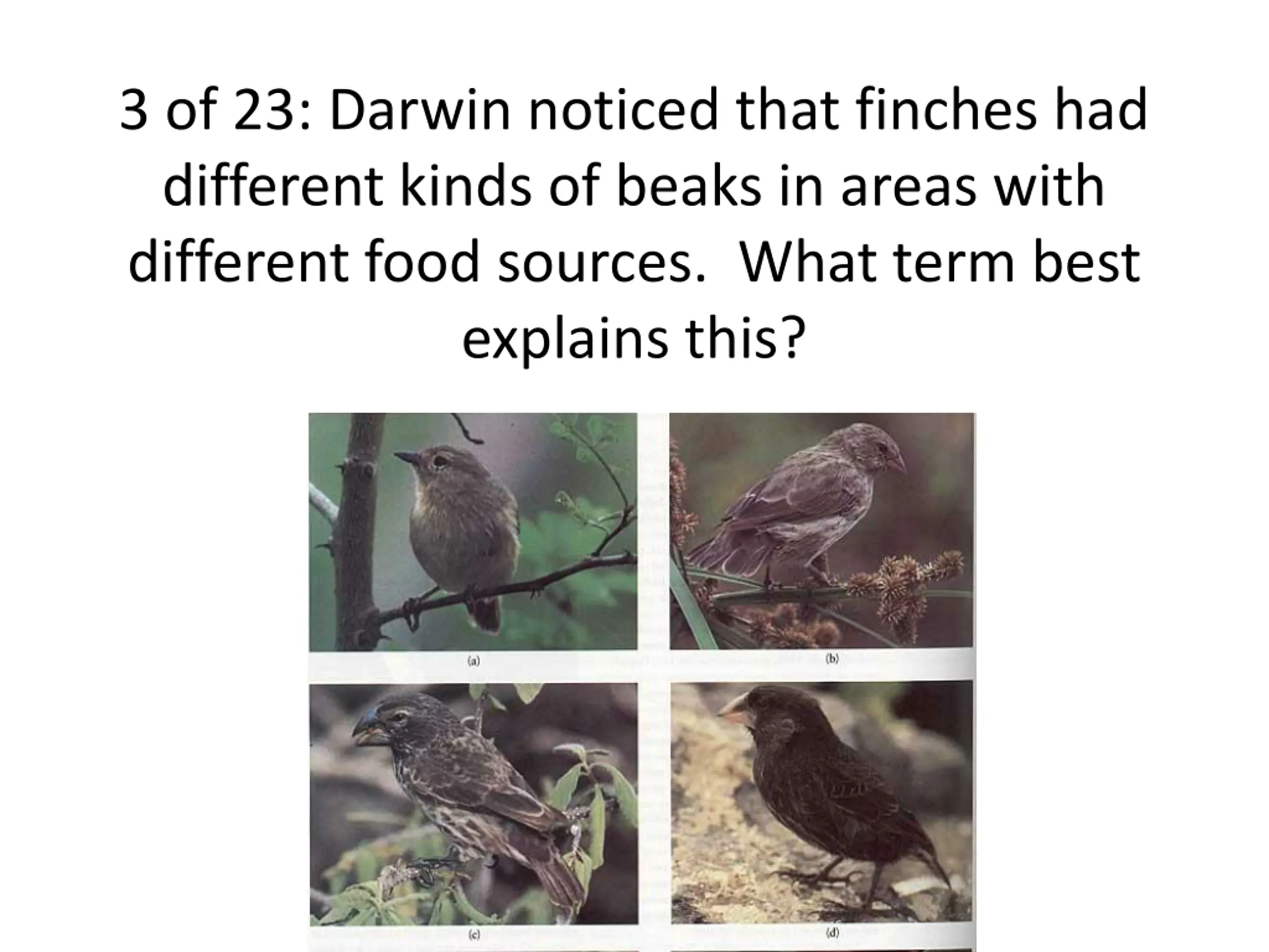 3 of 23: Darwin noticed that finches had different kinds of beaks in areas with different food sources. What term best explains this?