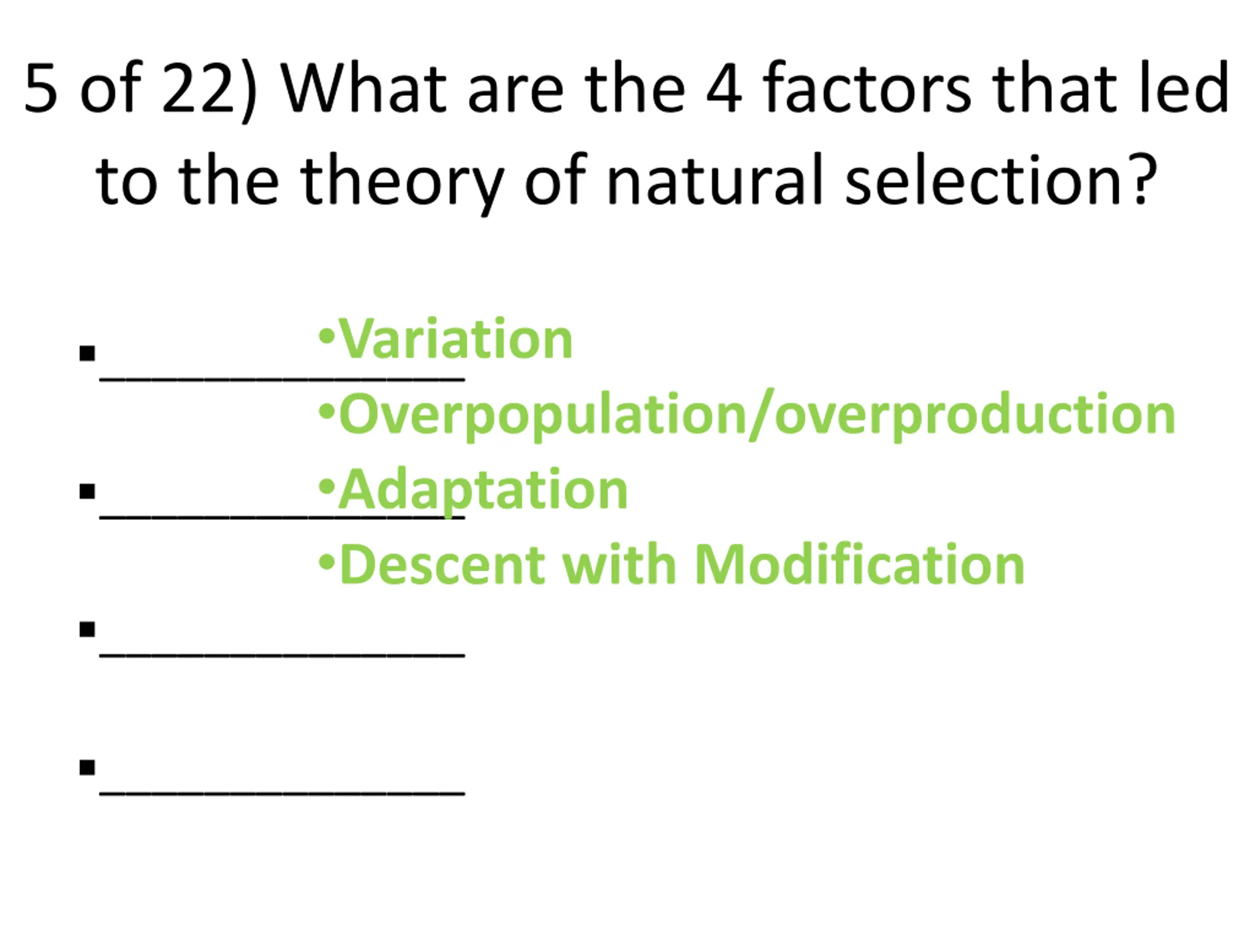 5 of 22) What are the 4 factors that led to the theory of natural selection? Variation Overpopulation/overproduction Adaptation Descent with Modification ______________ ______________ ______________ ______________