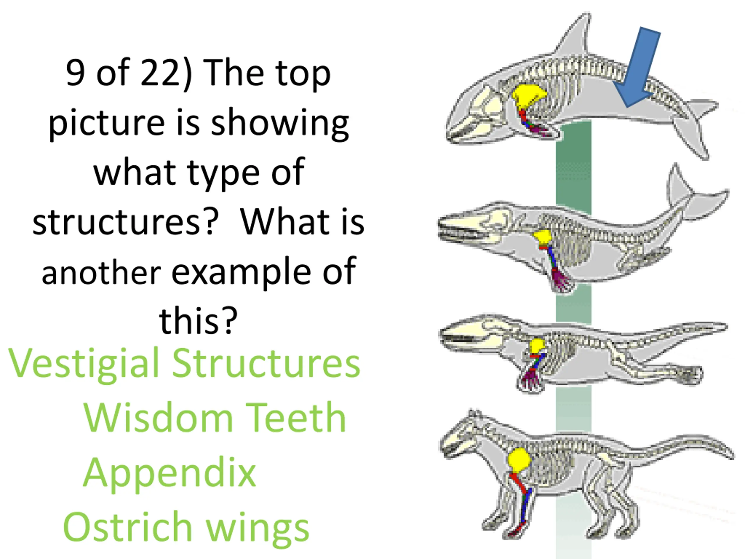 9 of 22) The top picture is showing what type of structures? What is another example of this? Vestigial Structures Wisdom Teeth Appendix Ostrich wings