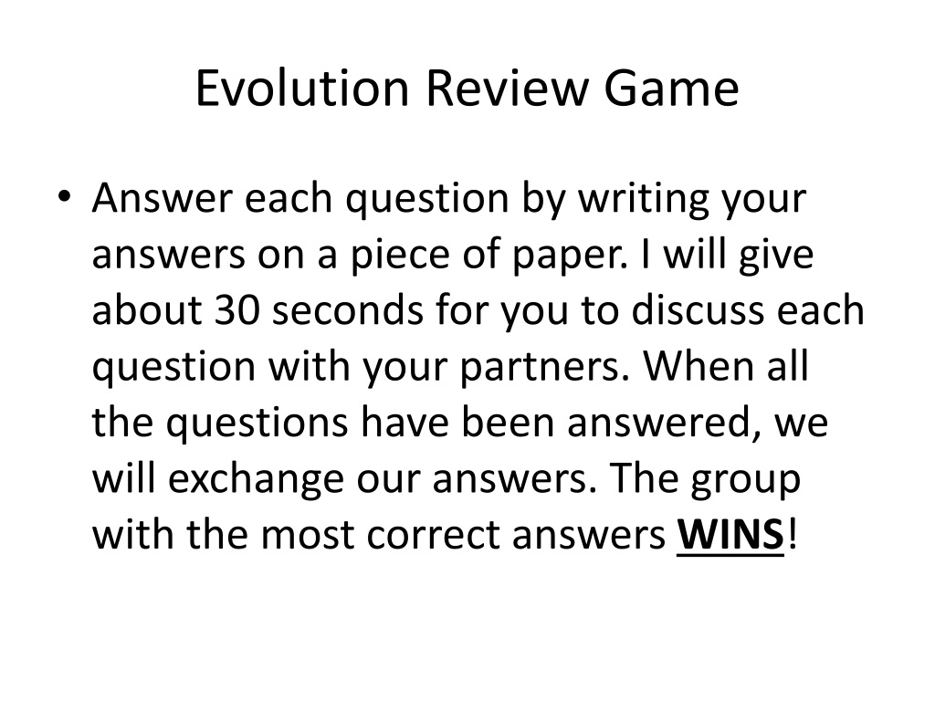 Evolution Review Game Answer each question by writing your answers on a piece of paper. I will give about 30 seconds for you to discuss each question with your partners. When all the questions have been answered, we will exchange our answers. The group with the most correct answers WINS!
