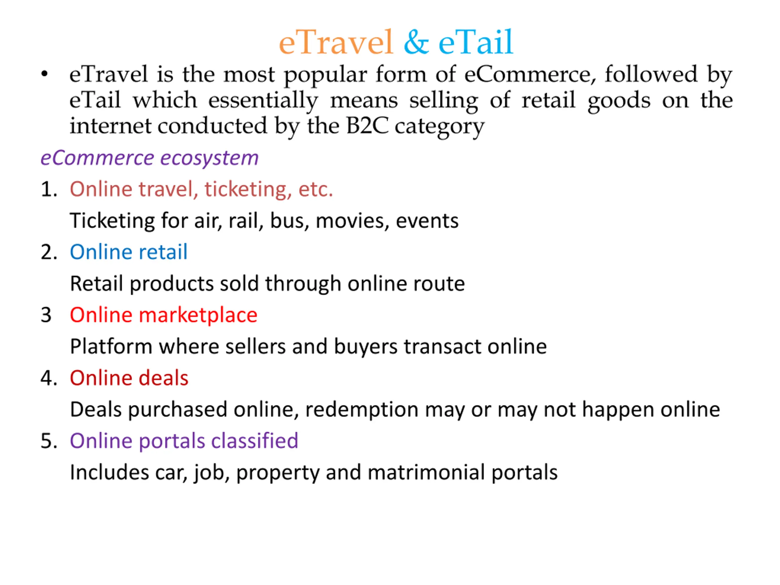 eTravel & eTail eTravel is the most popular form of eCommerce, followed by eTail which essentially means selling of retail goods on the internet conducted by the B2C category eCommerce ecosystem 1. Online travel, ticketing, etc. Ticketing for air, rail, bus, movies, events 2. Online retail Retail products sold through online route 3 Online marketplace Platform where sellers and buyers transact online 4. Online deals Deals purchased online, redemption may or may not happen online 5. Online portals classified Includes car, job, property and matrimonial portals