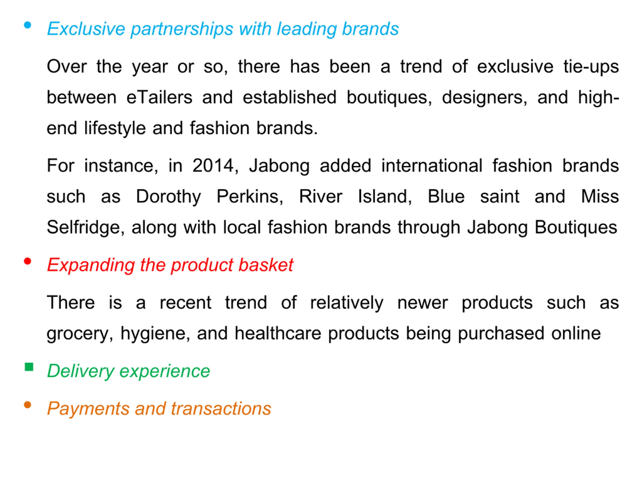 Exclusivepartnershipswithleadingbrands Over the year or so, there has been a trend of exclusive tie-ups between eTailers and established boutiques, designers, and high- end lifestyle and fashion brands. For instance, in 2014, Jabong added international fashion brands such as Dorothy Perkins, River Island, Blue saint and Miss Selfridge, along with local fashion brands through Jabong Boutiques Expandingtheproductbasket There is a recent trend of relatively newer products such as grocery, hygiene, and healthcare products being purchased online Deliveryexperience Payments and transactions