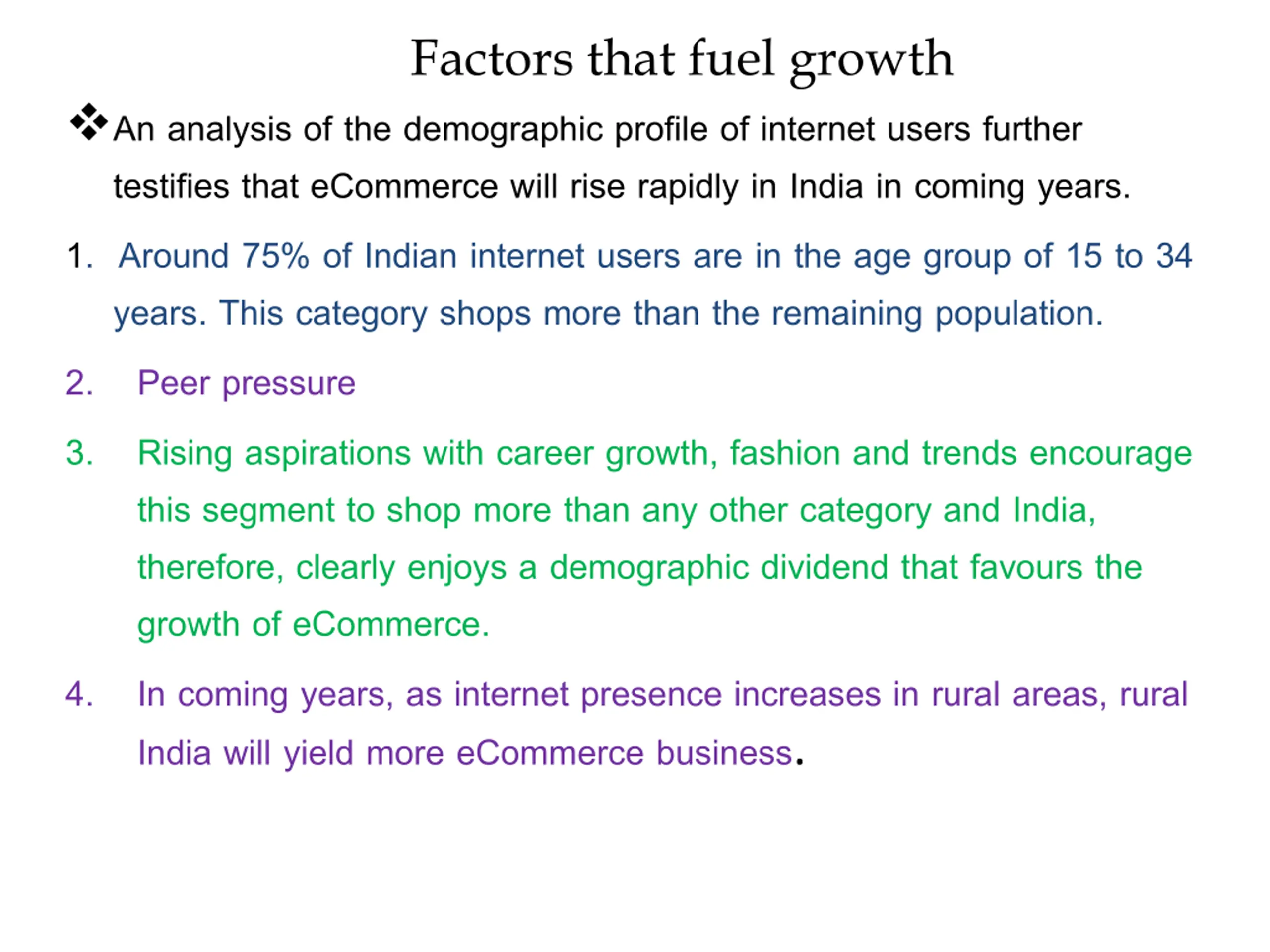 Factors that fuel growth An analysis of the demographic profile of internet users further testifies that eCommerce will rise rapidly in India in coming years. 1. Around 75% of Indian internet users are in the age group of 15 to 34 years. This category shops more than the remaining population. 2. Peer pressure 3. Rising aspirations with career growth, fashion and trends encourage this segment to shop more than any other category and India, therefore, clearly enjoys a demographic dividend that favours the growth of eCommerce. 4. In coming years, as internet presence increases in rural areas, rural India will yield more eCommerce business.