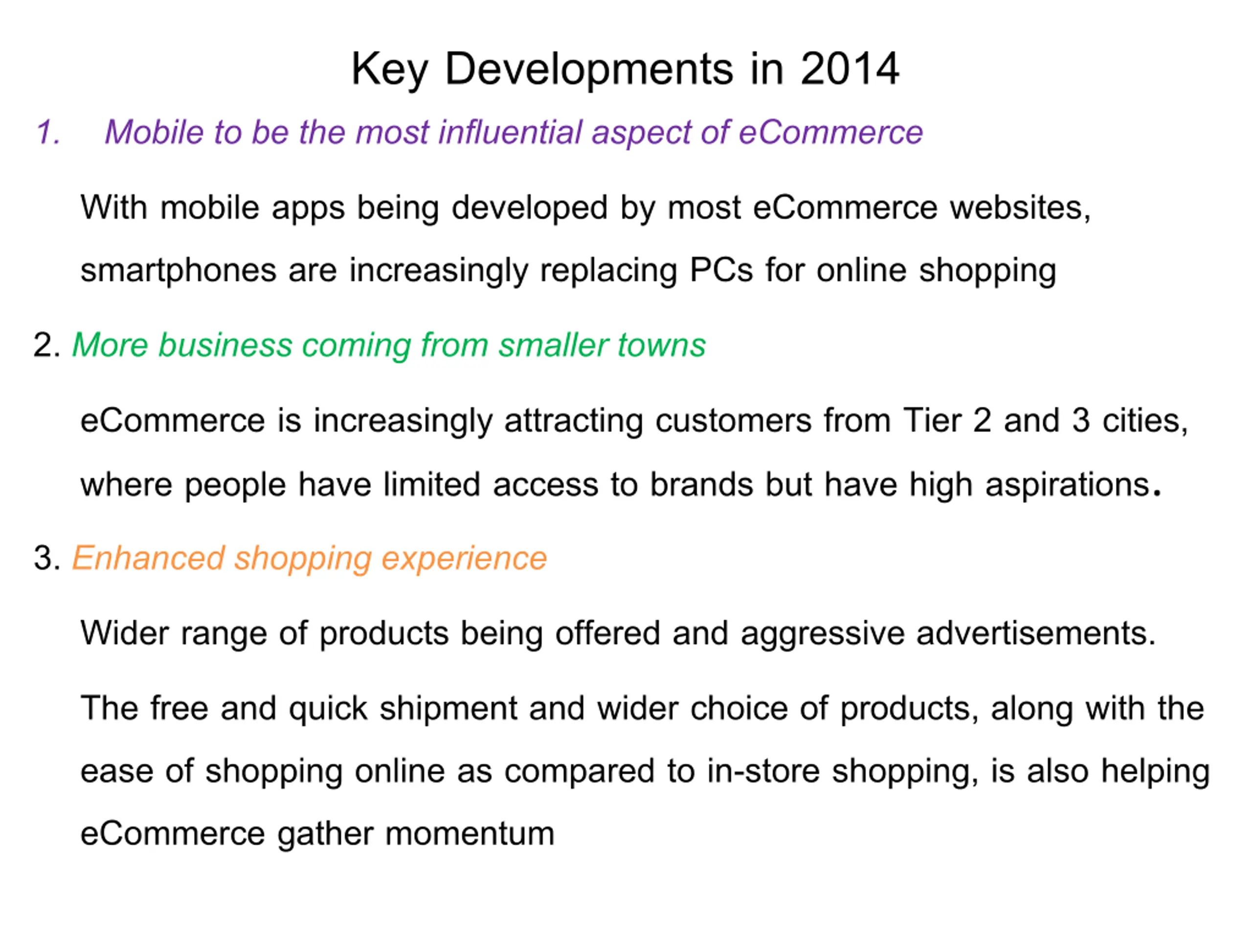 Key Developments in 2014 1. Mobile to be the most influential aspect of eCommerce With mobile apps being developed by most eCommerce websites, smartphones are increasingly replacing PCs for online shopping 2.More business coming from smaller towns eCommerce is increasingly attracting customers from Tier 2 and 3 cities, where people have limited access to brands but have high aspirations. 3.Enhanced shopping experience Wider range of products being offered and aggressive advertisements. The free and quick shipment and wider choice of products, along with the ease of shopping online as compared to in-store shopping, is also helping eCommerce gather momentum
