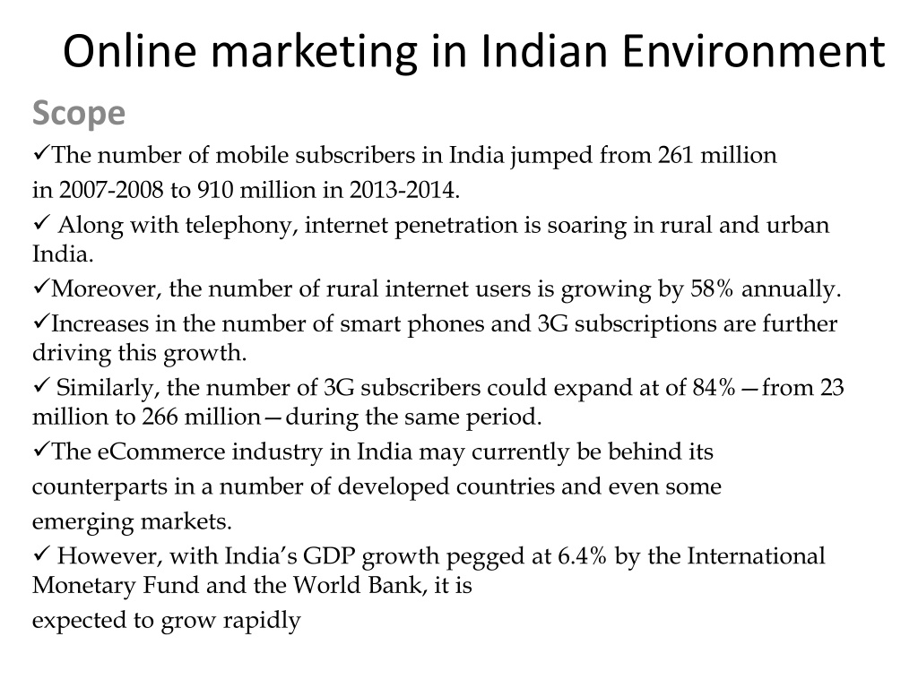 Online marketing in Indian Environment Scope The number of mobile subscribers in India jumped from 261 million in 2007-2008 to 910 million in 2013-2014. Along with telephony, internet penetration is soaring in rural and urban India. Moreover, the number of rural internet users is growing by 58% annually. Increases in the number of smart phones and 3G subscriptions are further driving this growth. Similarly, the number of 3G subscribers could expand at of 84% from 23 million to 266 million during the same period. The eCommerce industry in India may currently be behind its counterparts in a number of developed countries and even some emerging markets. However, with India s GDP growth pegged at 6.4% by the International Monetary Fund and the World Bank, it is expected to grow rapidly