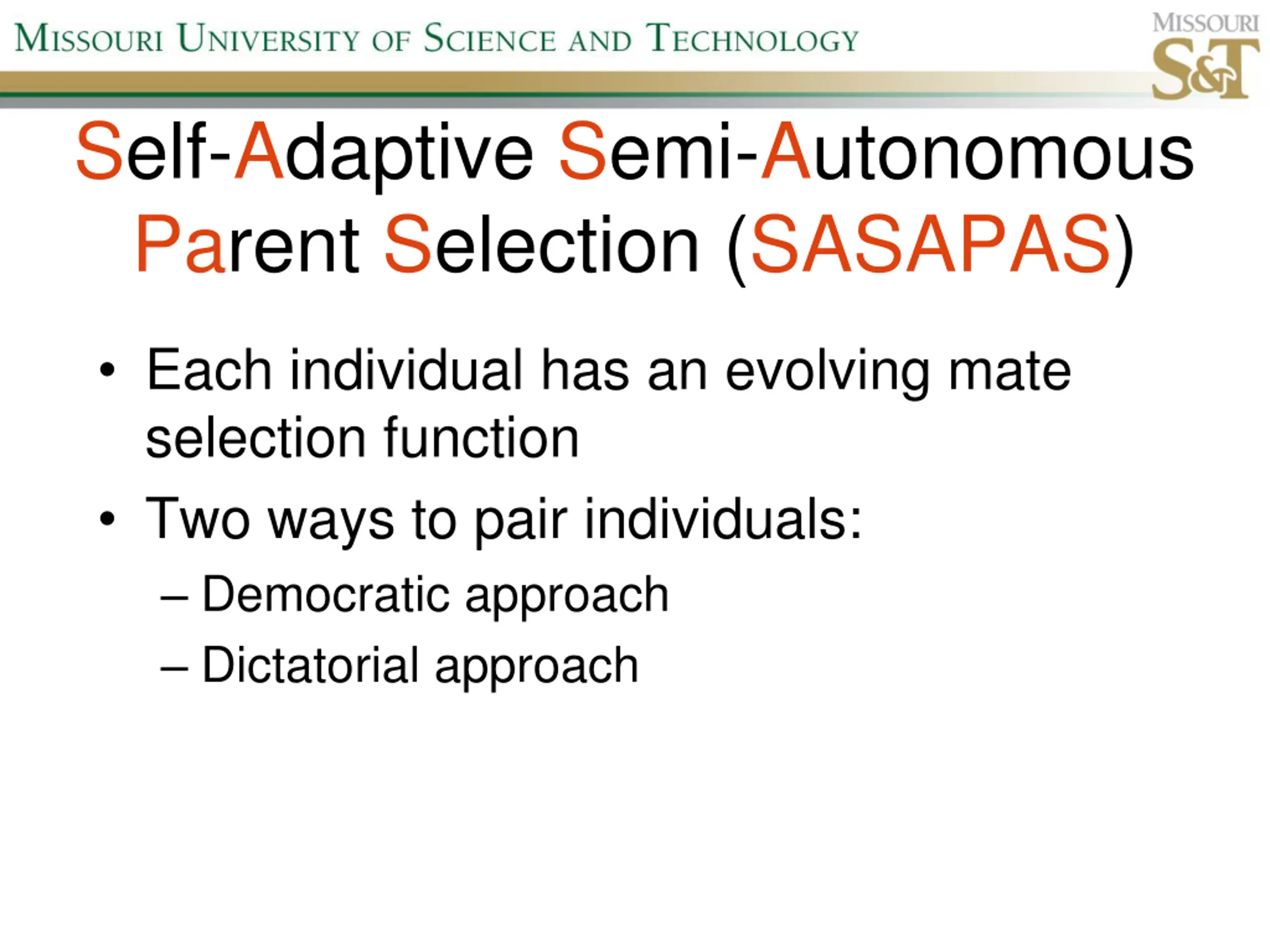 Self-Adaptive Semi-Autonomous Parent Selection (SASAPAS) Each individual has an evolving mate selection function Two ways to pair individuals: Democratic approach Dictatorial approach