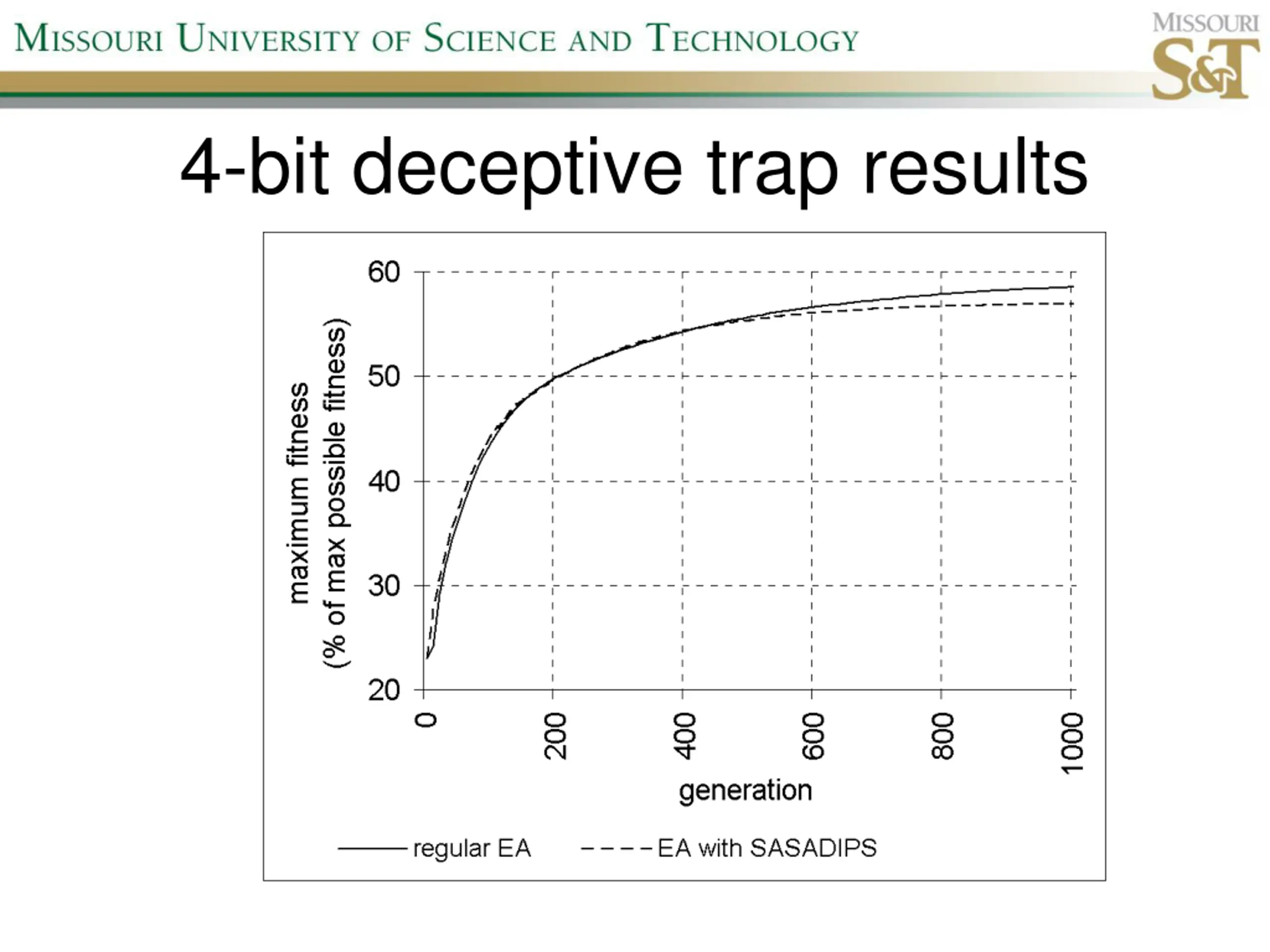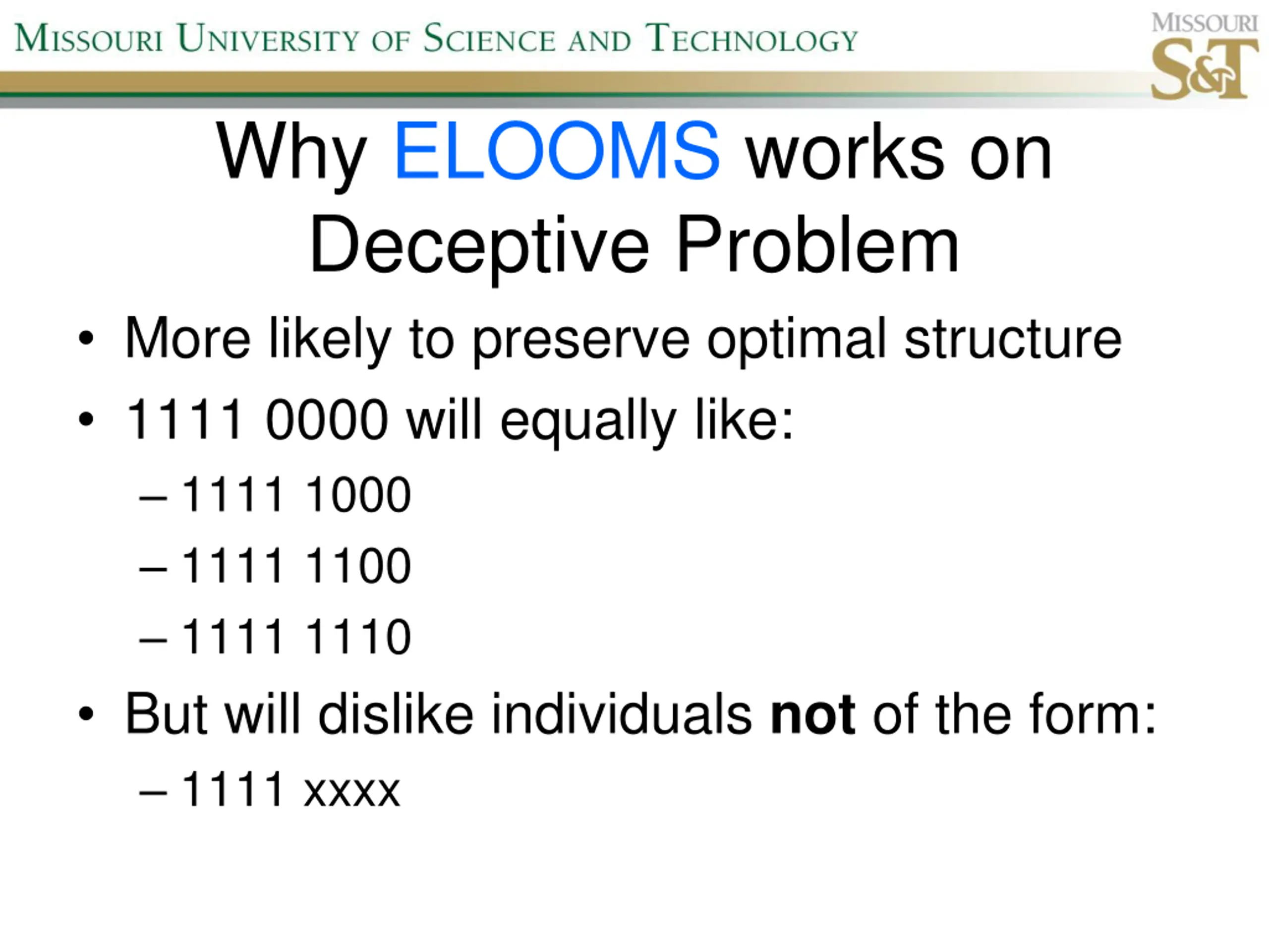 Why ELOOMS works on Deceptive Problem More likely to preserve optimal structure 1111 0000 will equally like: 1111 1000 1111 1100 1111 1110 But will dislike individuals not of the form: 1111 xxxx