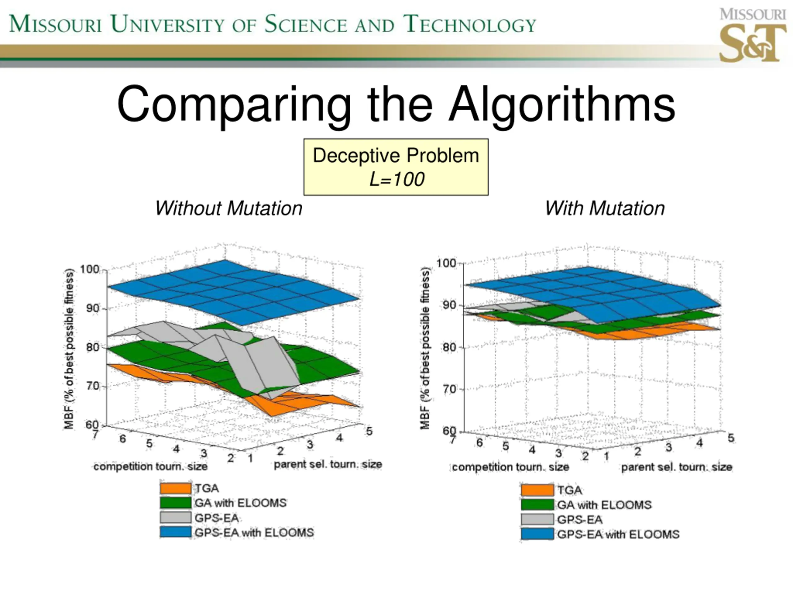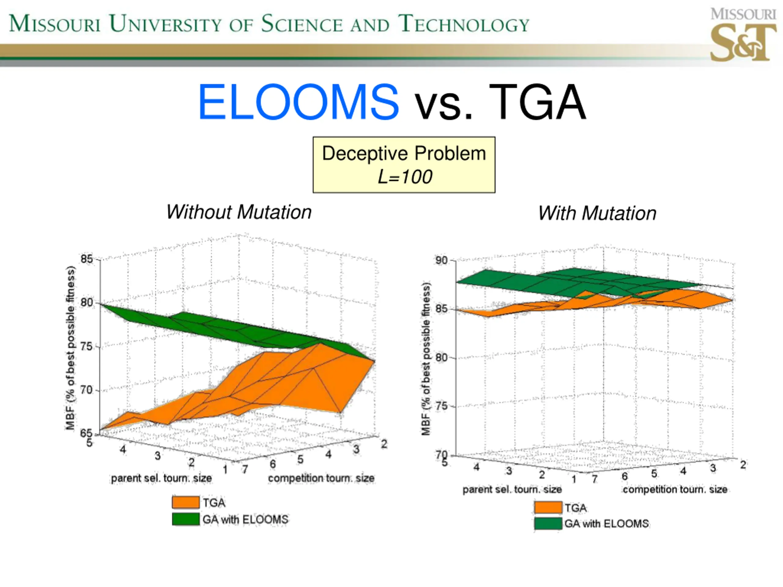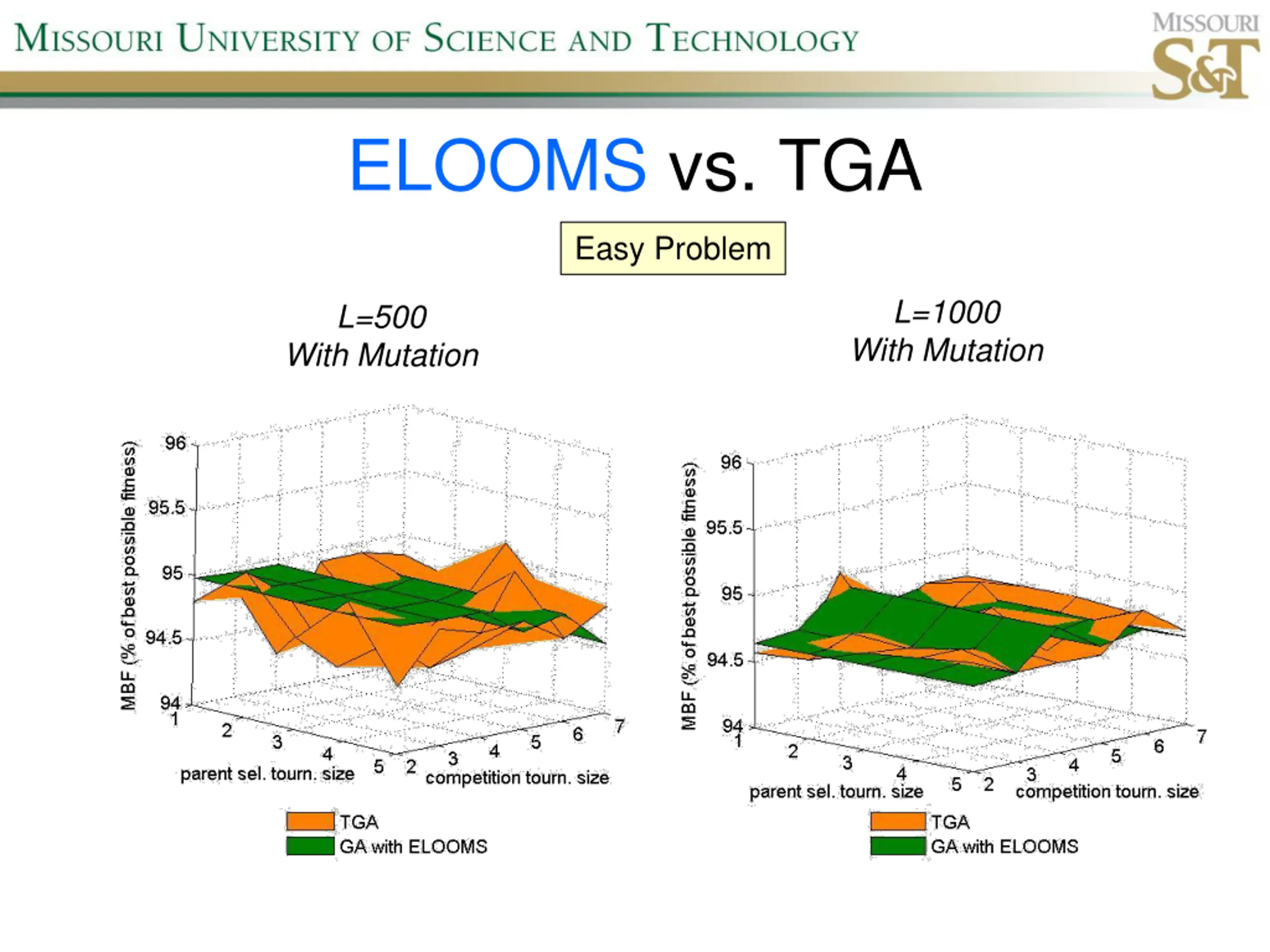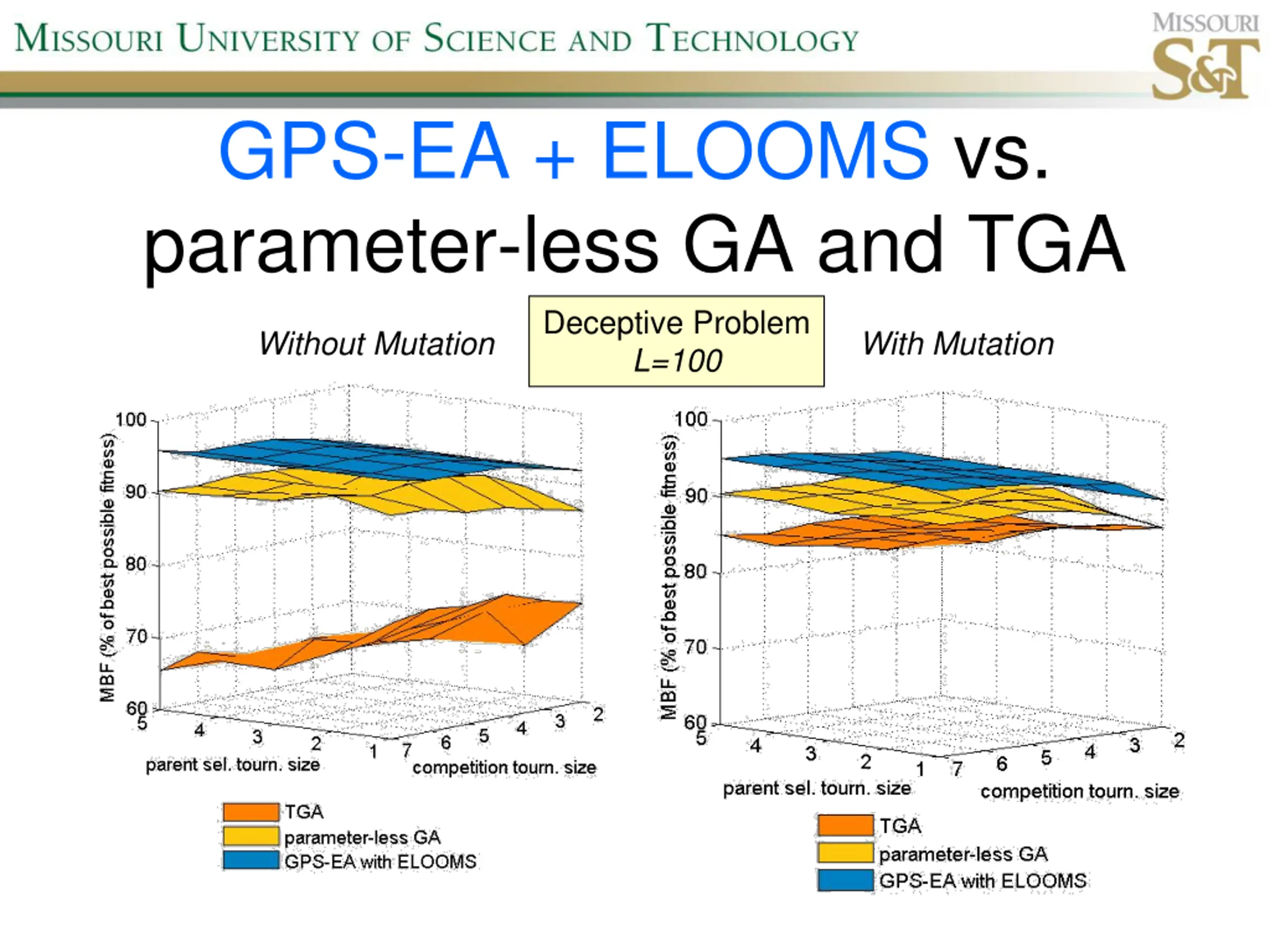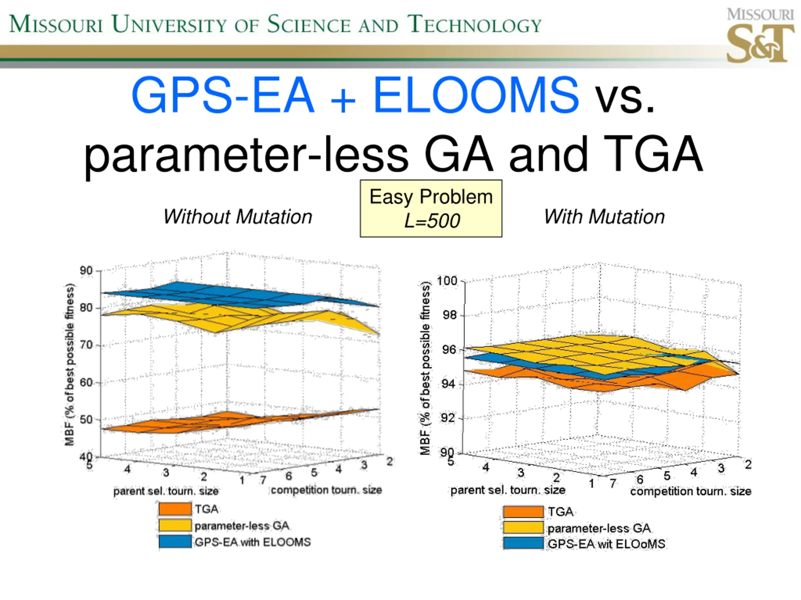 GPS-EA + ELOOMS vs. parameter-less GA and TGA Easy Problem Without Mutation With Mutation L=500