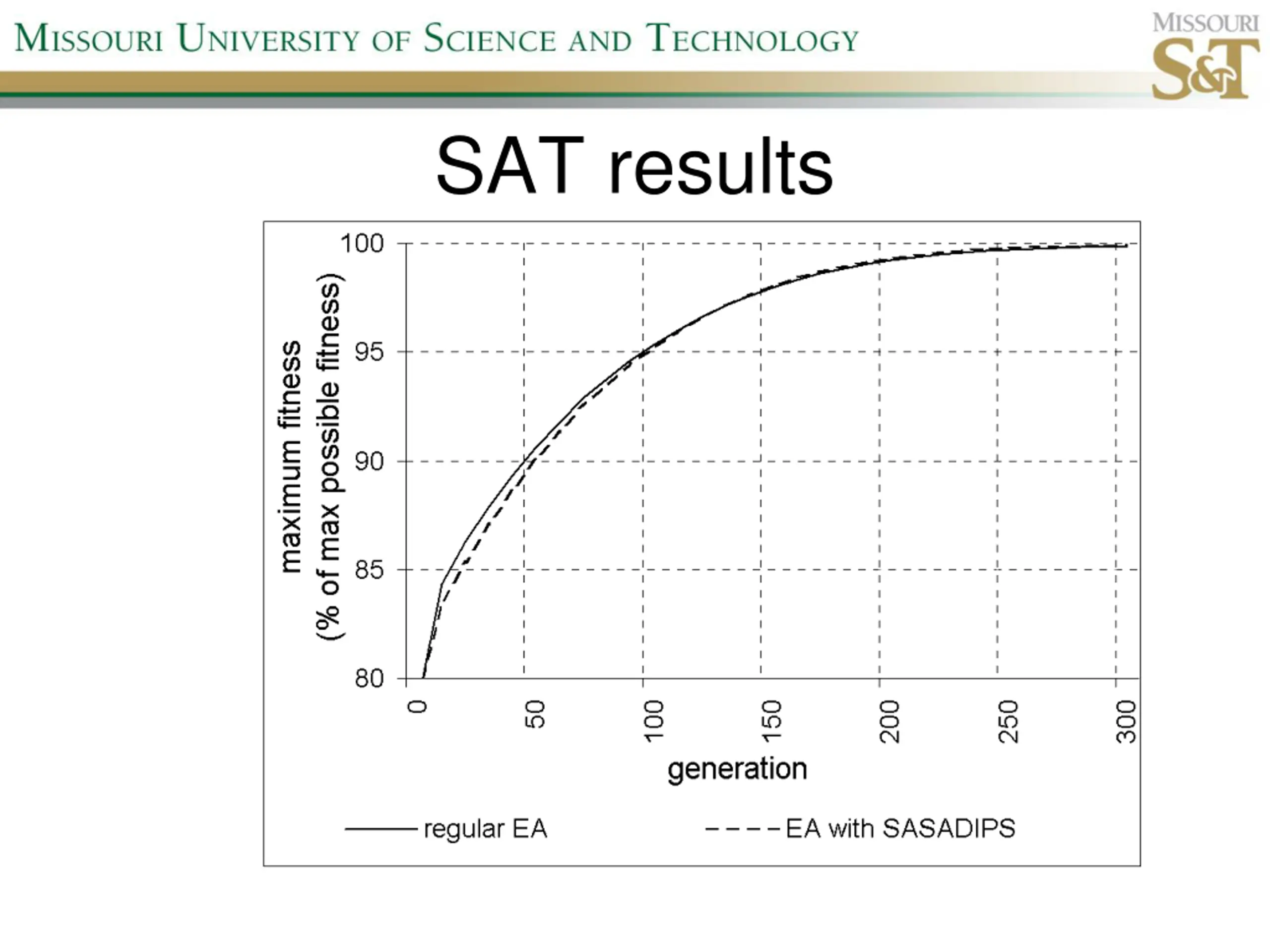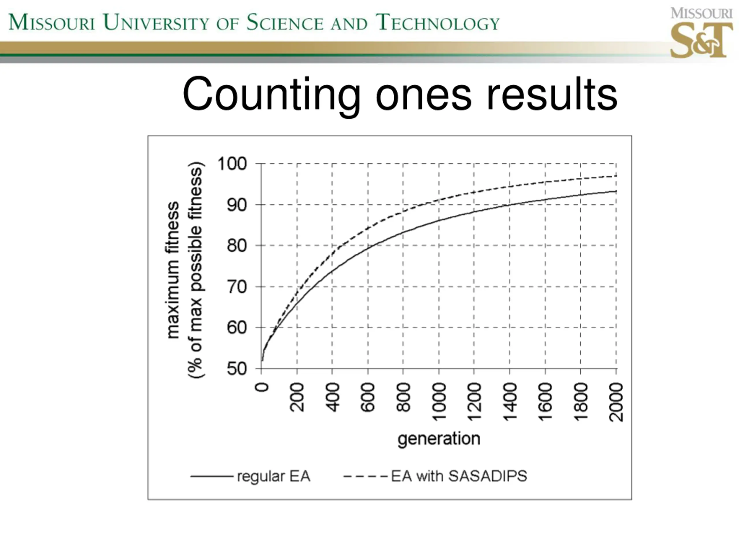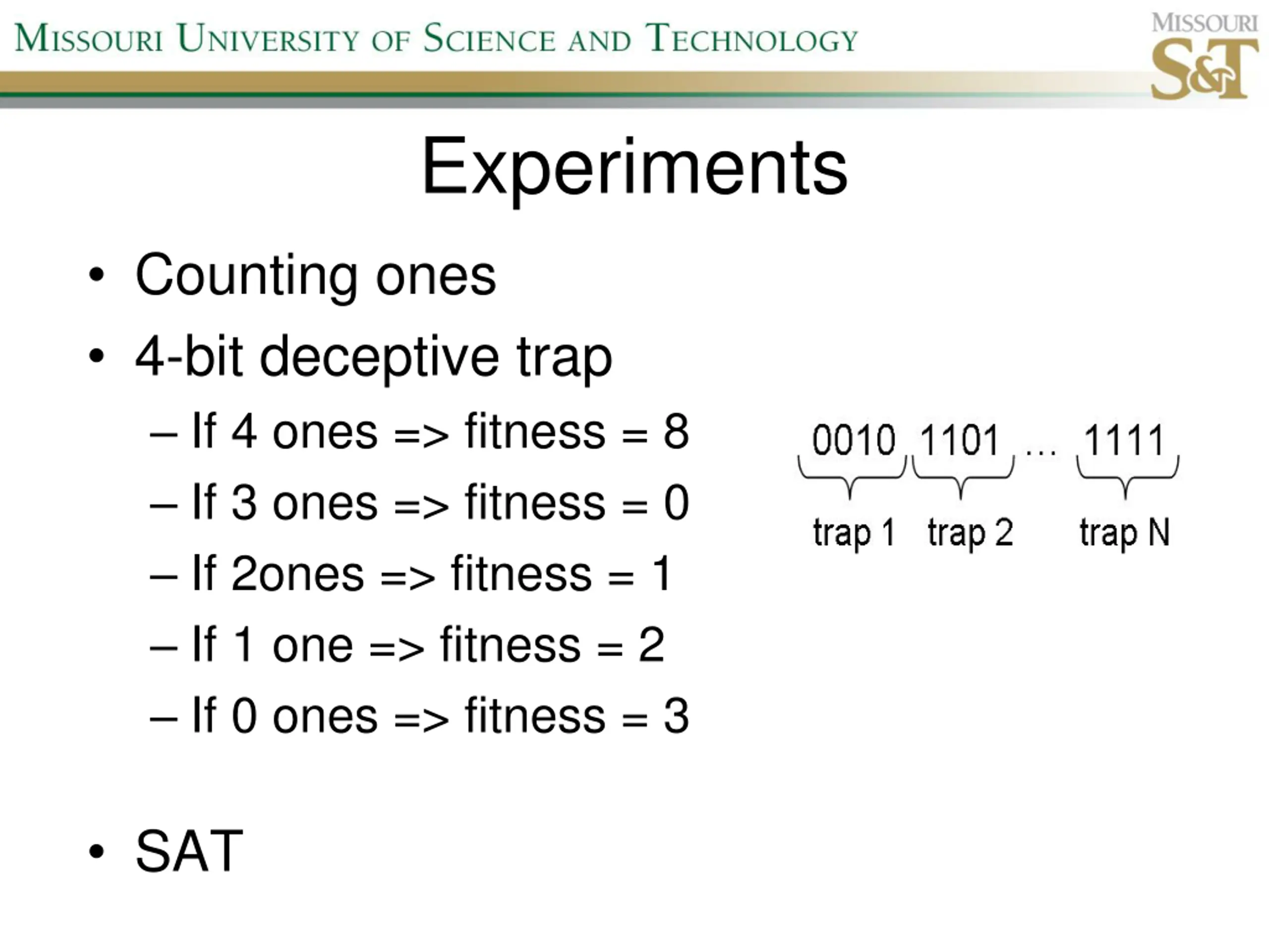 Experiments Counting ones 4-bit deceptive trap If 4 ones => fitness = 8 If 3 ones => fitness = 0 If 2ones => fitness = 1 If 1 one => fitness = 2 If 0 ones => fitness = 3 SAT