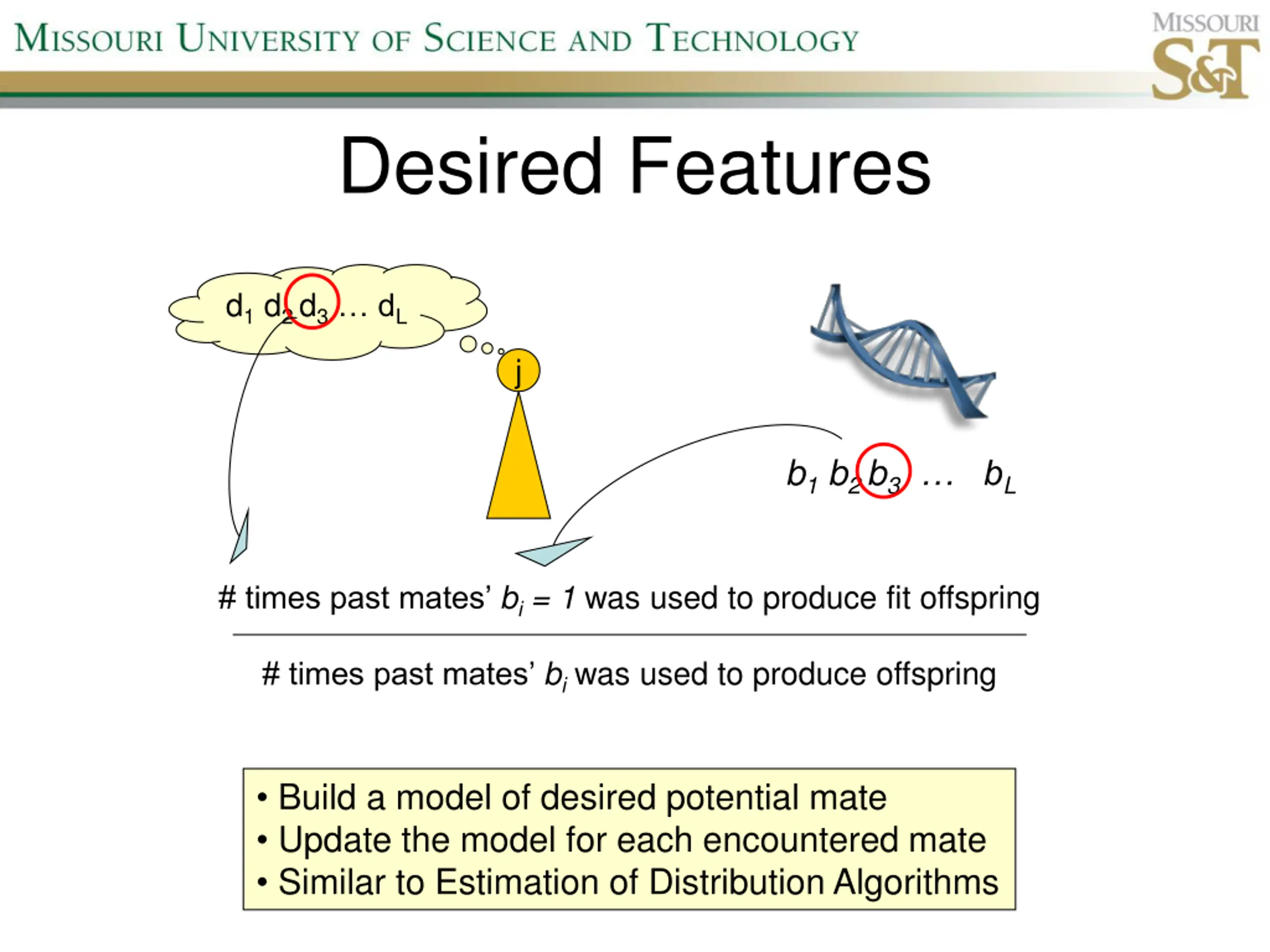 Desired Features d1 d2 d3 dL j b1 b2 b3 bL # times past mates bi = 1 was used to produce fit offspring # times past mates bi was used to produce offspring Build a model of desired potential mate Update the model for each encountered mate Similar to Estimation of Distribution Algorithms