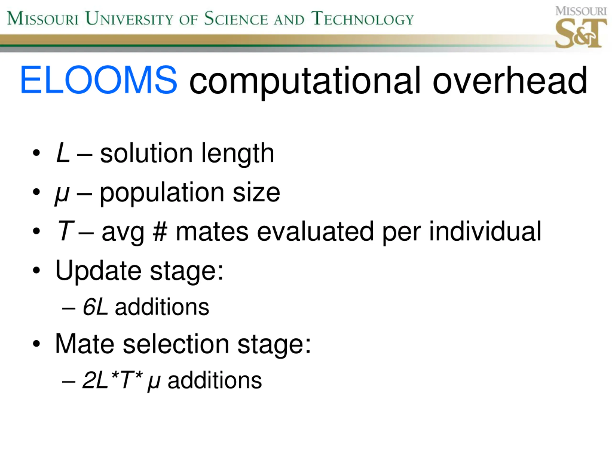 ELOOMS computational overhead L solution length population size T avg # mates evaluated per individual Update stage: 6L additions Mate selection stage: 2L*T* additions