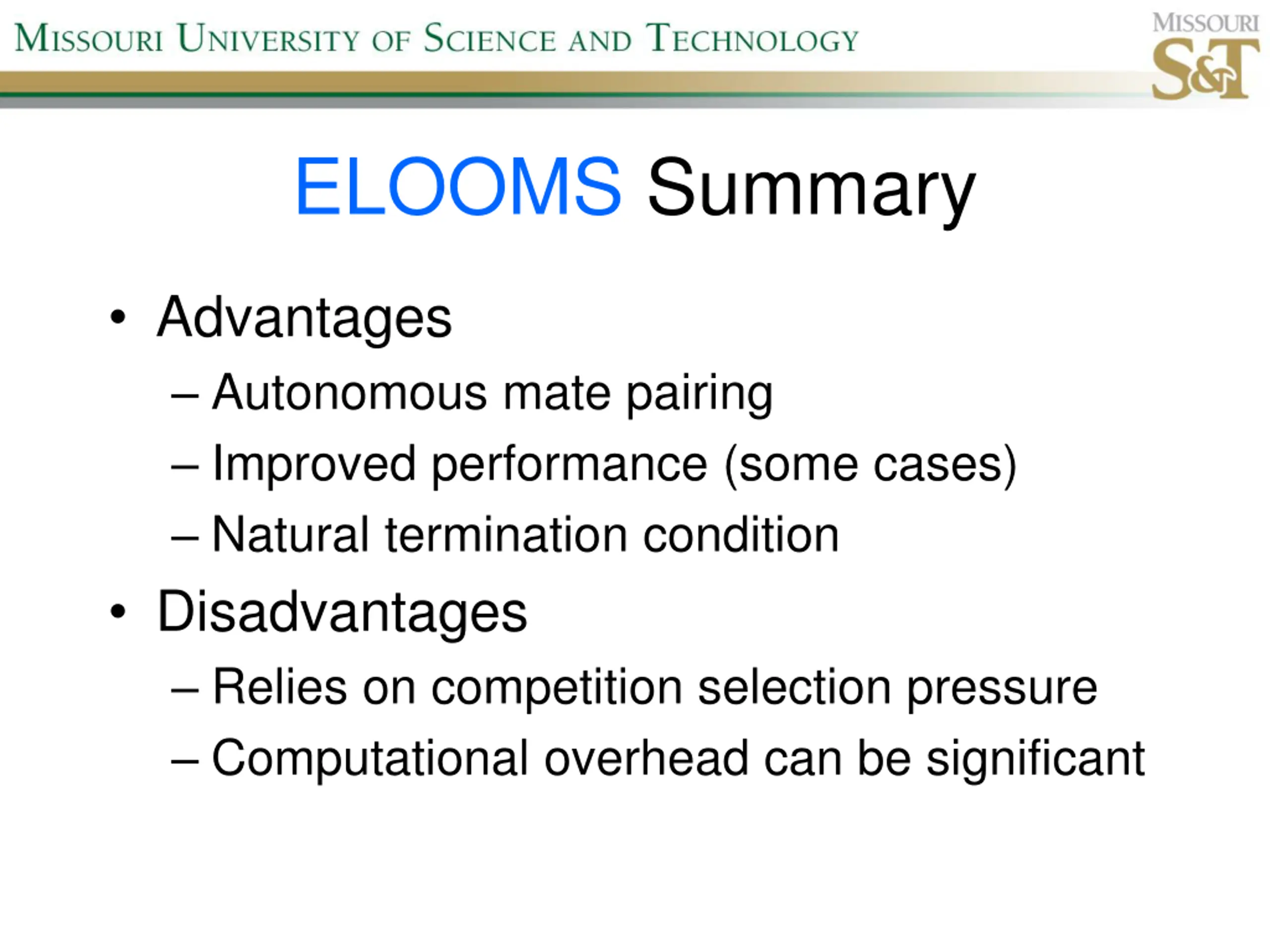 ELOOMS Summary Advantages Autonomous mate pairing Improved performance (some cases) Natural termination condition Disadvantages Relies on competition selection pressure Computational overhead can be significant