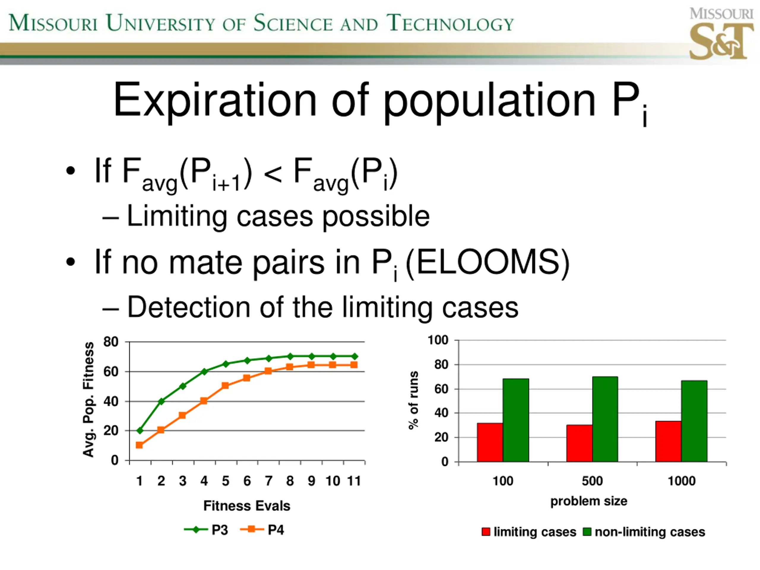Expiration of population Pi If Favg(Pi+1) < Favg(Pi) Limiting cases possible If no mate pairs in Pi (ELOOMS) Detection of the limiting cases 100 80 Avg. Pop. Fitness 80 60 % of runs 60 40 40 20 20 0 0 1 2 3 4 5 6 7 8 9 10 11 100 500 1000 problem size Fitness Evals P3 P4 limiting cases non-limiting cases