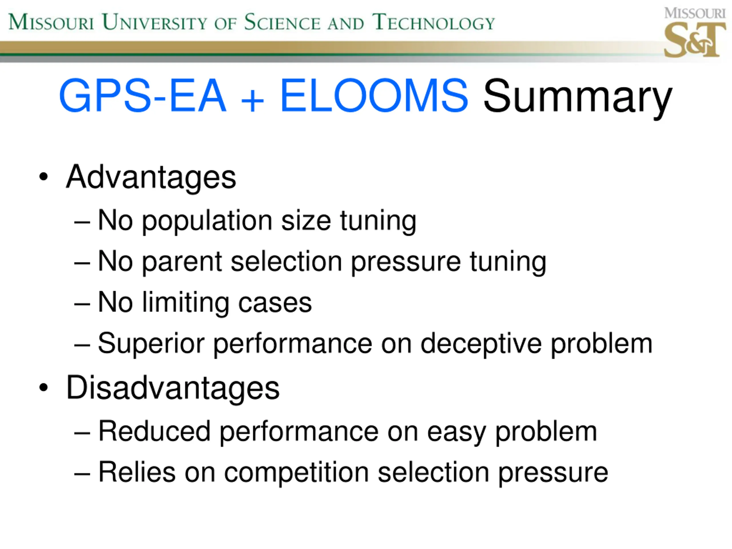 GPS-EA + ELOOMS Summary Advantages No population size tuning No parent selection pressure tuning No limiting cases Superior performance on deceptive problem Disadvantages Reduced performance on easy problem Relies on competition selection pressure