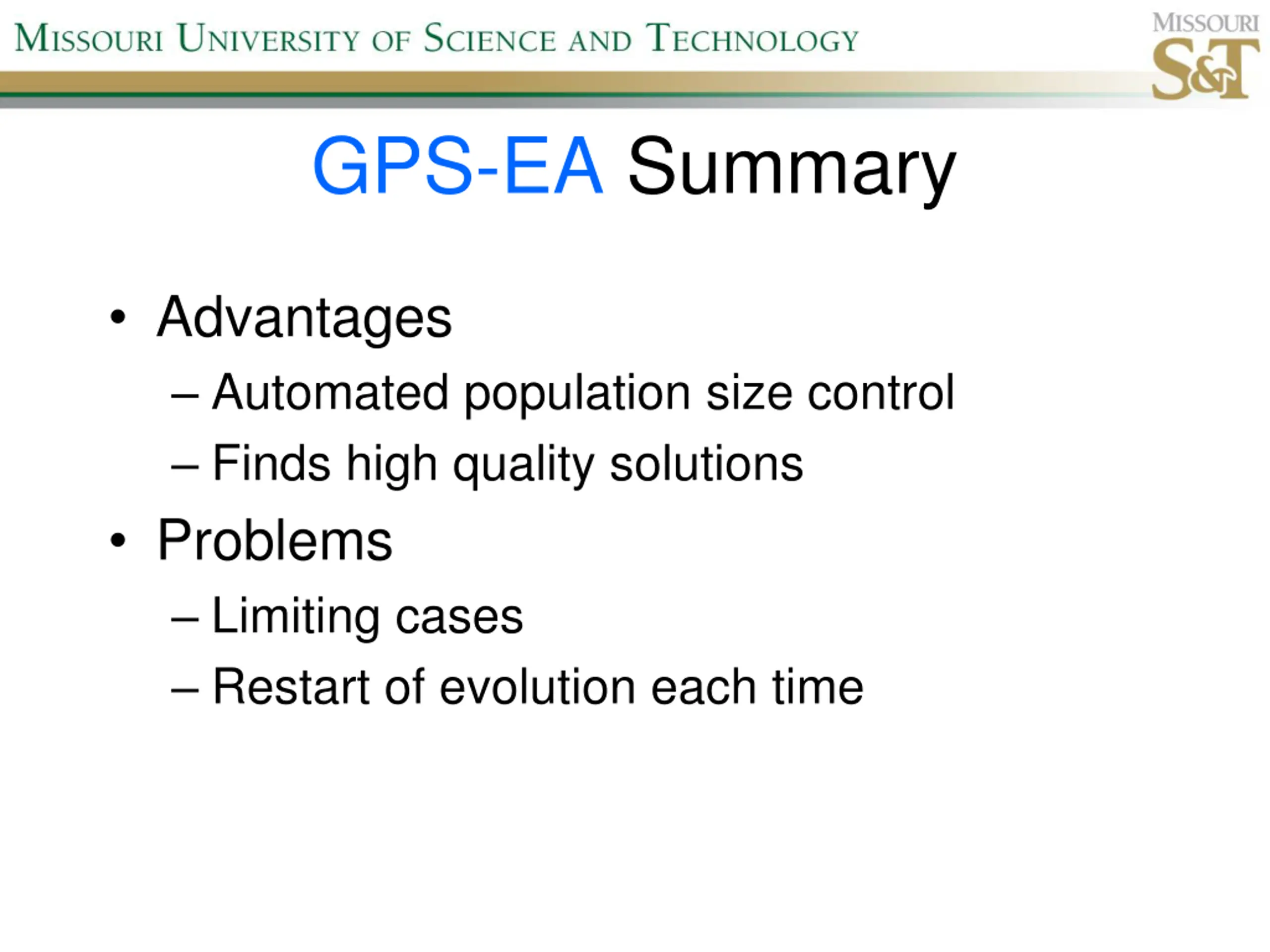 GPS-EA Summary Advantages Automated population size control Finds high quality solutions Problems Limiting cases Restart of evolution each time