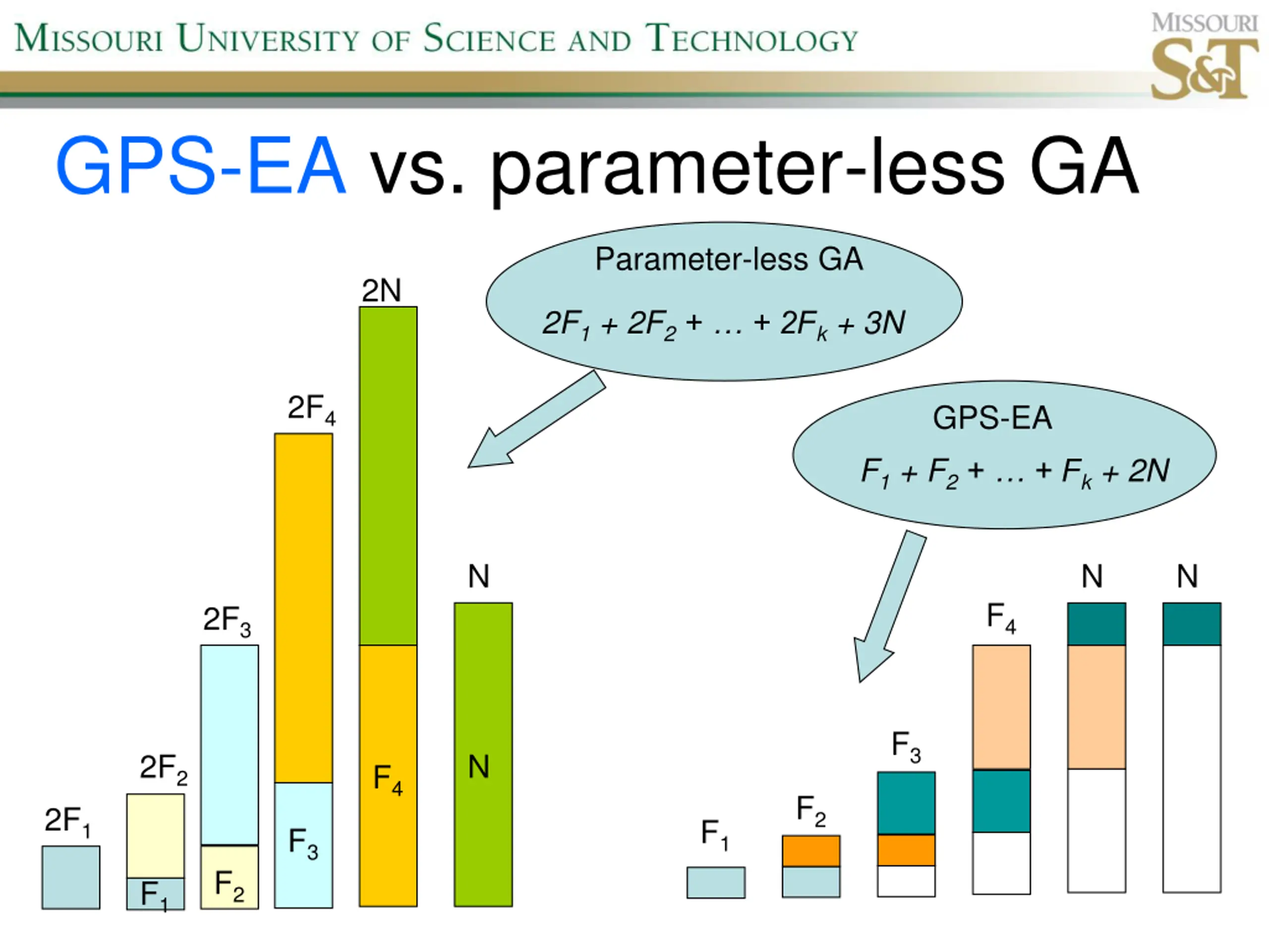 GPS-EA vs. parameter-less GA Parameter-less GA 2N 2F1 + 2F2+ + 2Fk + 3N 2F4 GPS-EA F1 + F2+ + Fk + 2N N N N F4 2F3 F3 2F2 N F4 F2 2F1 F1 F3 F2 F1