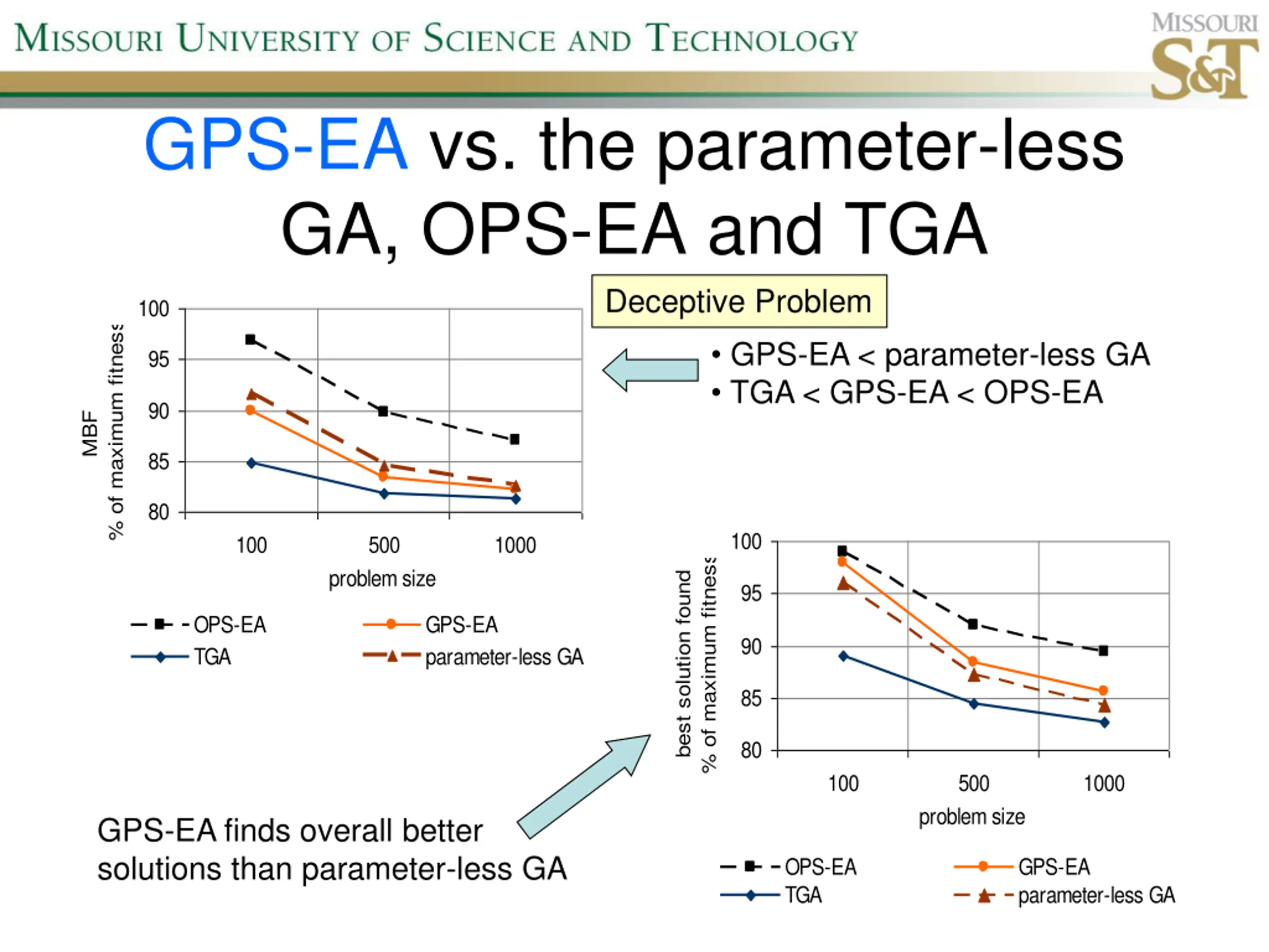 GPS-EA vs. the parameter-less GA, OPS-EA and TGA Deceptive Problem 100 % of maximum fitness GPS-EA < parameter-less GA TGA < GPS-EA < OPS-EA 95 90 MBF 85 80 100 100 500 1000 % of maximum fitness best solution found problem size 95 OPS-EA TGA GPS-EA parameter-less GA 90 85 80 100 500 1000 problem size GPS-EA finds overall better solutions than parameter-less GA OPS-EA TGA GPS-EA parameter-less GA