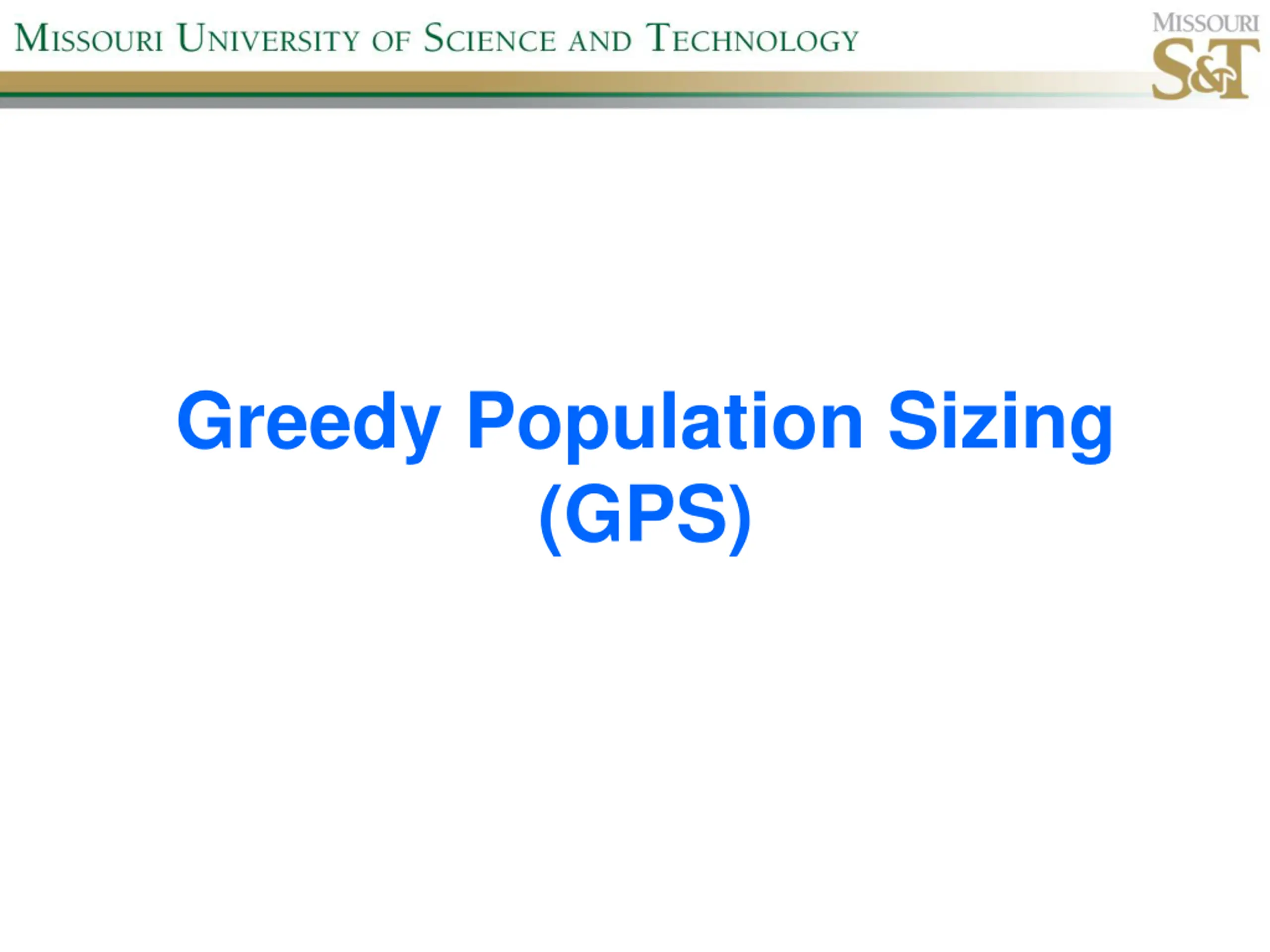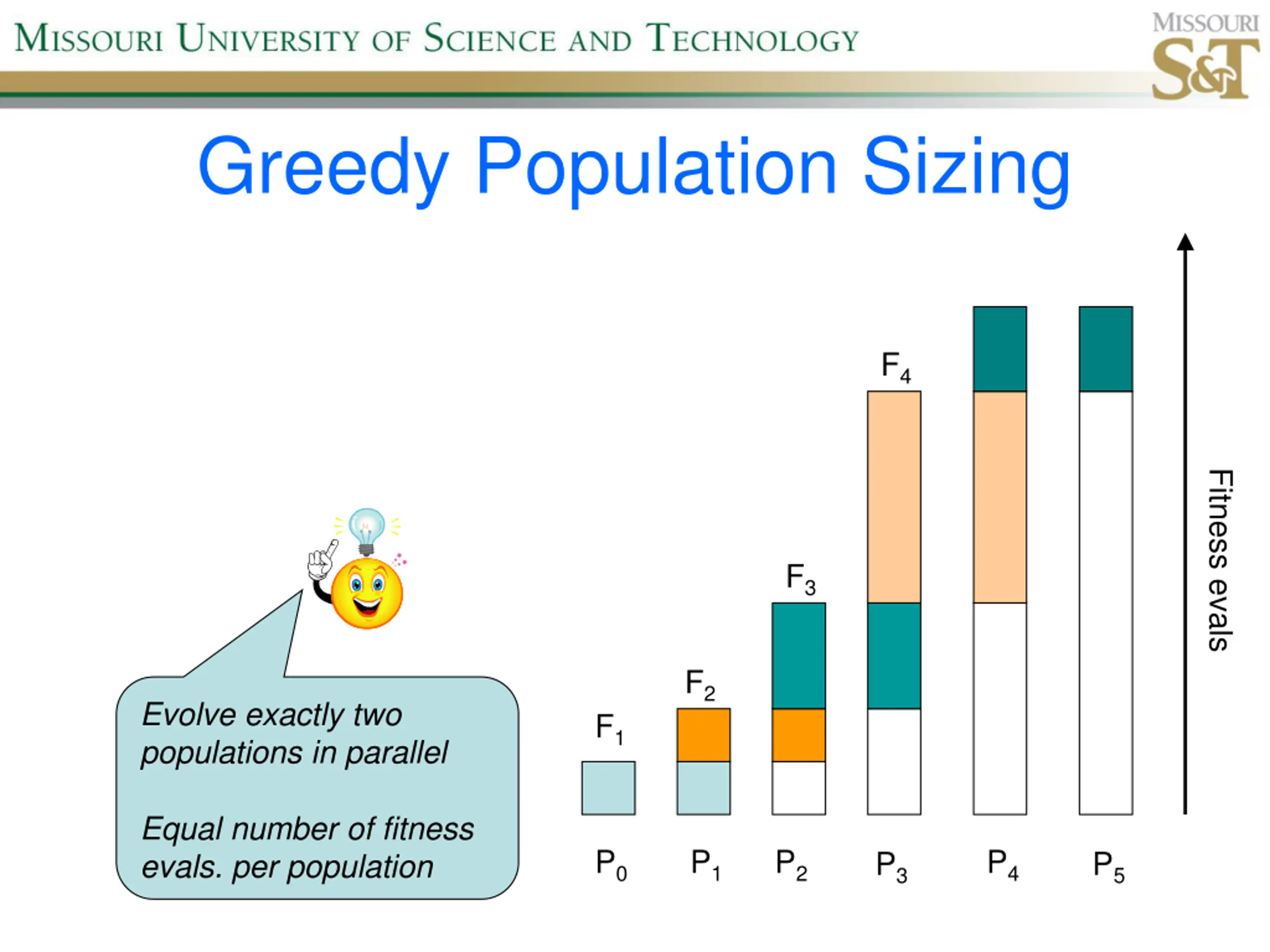 Greedy Population Sizing F4 Fitness evals F3 F2 Evolve exactly two populations in parallel F1 Equal number of fitness evals. per population P0 P1 P2 P4 P3 P5