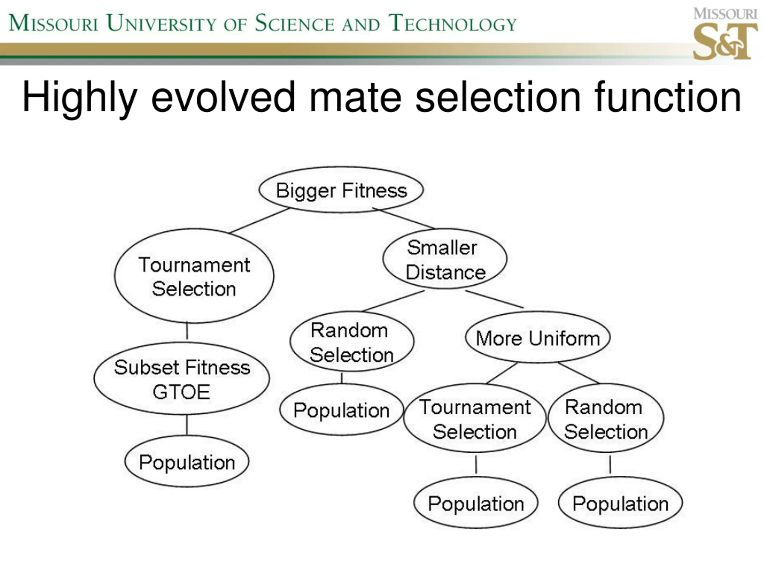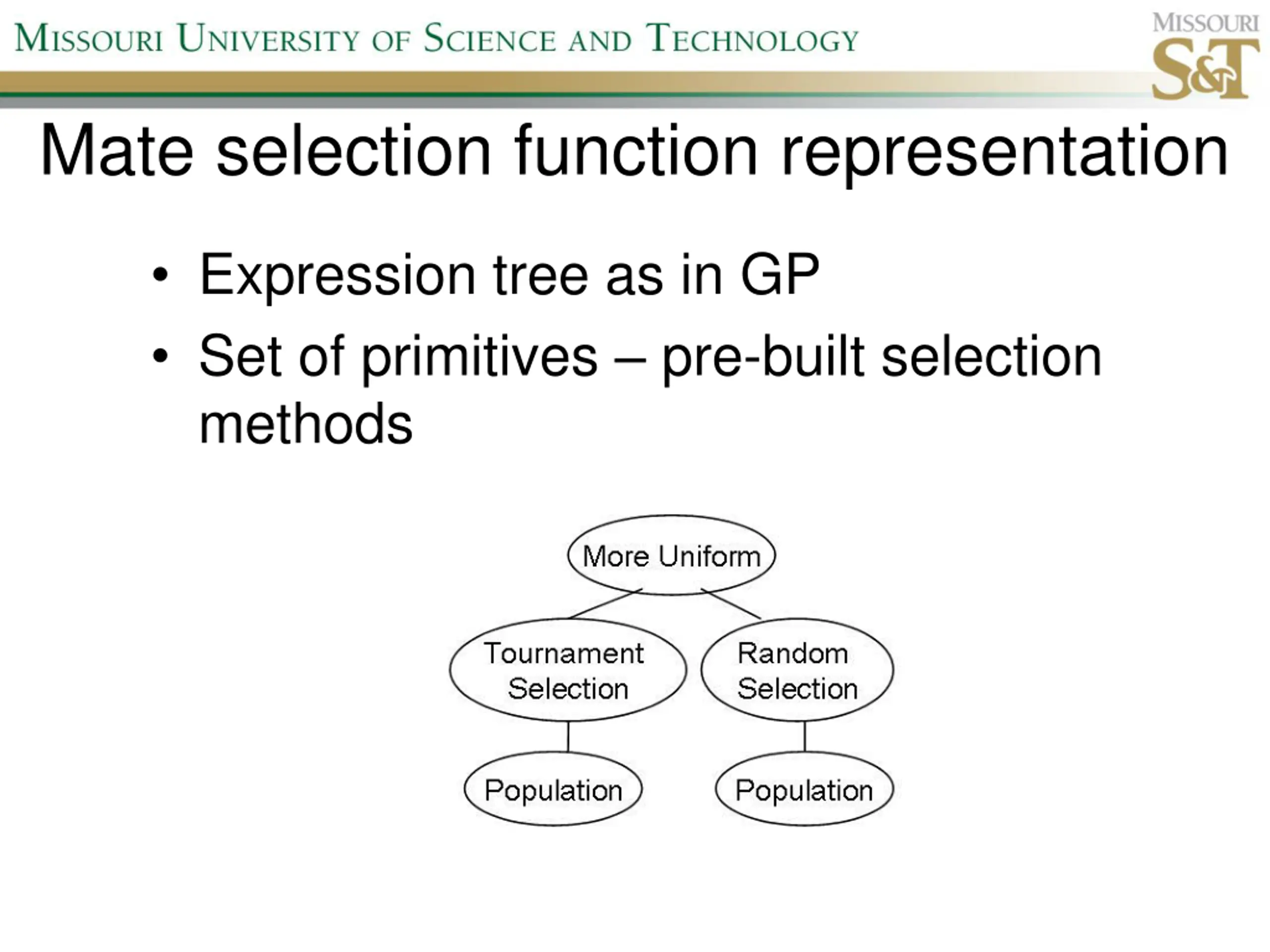 Mate selection function representation Expression tree as in GP Set of primitives pre-built selection methods