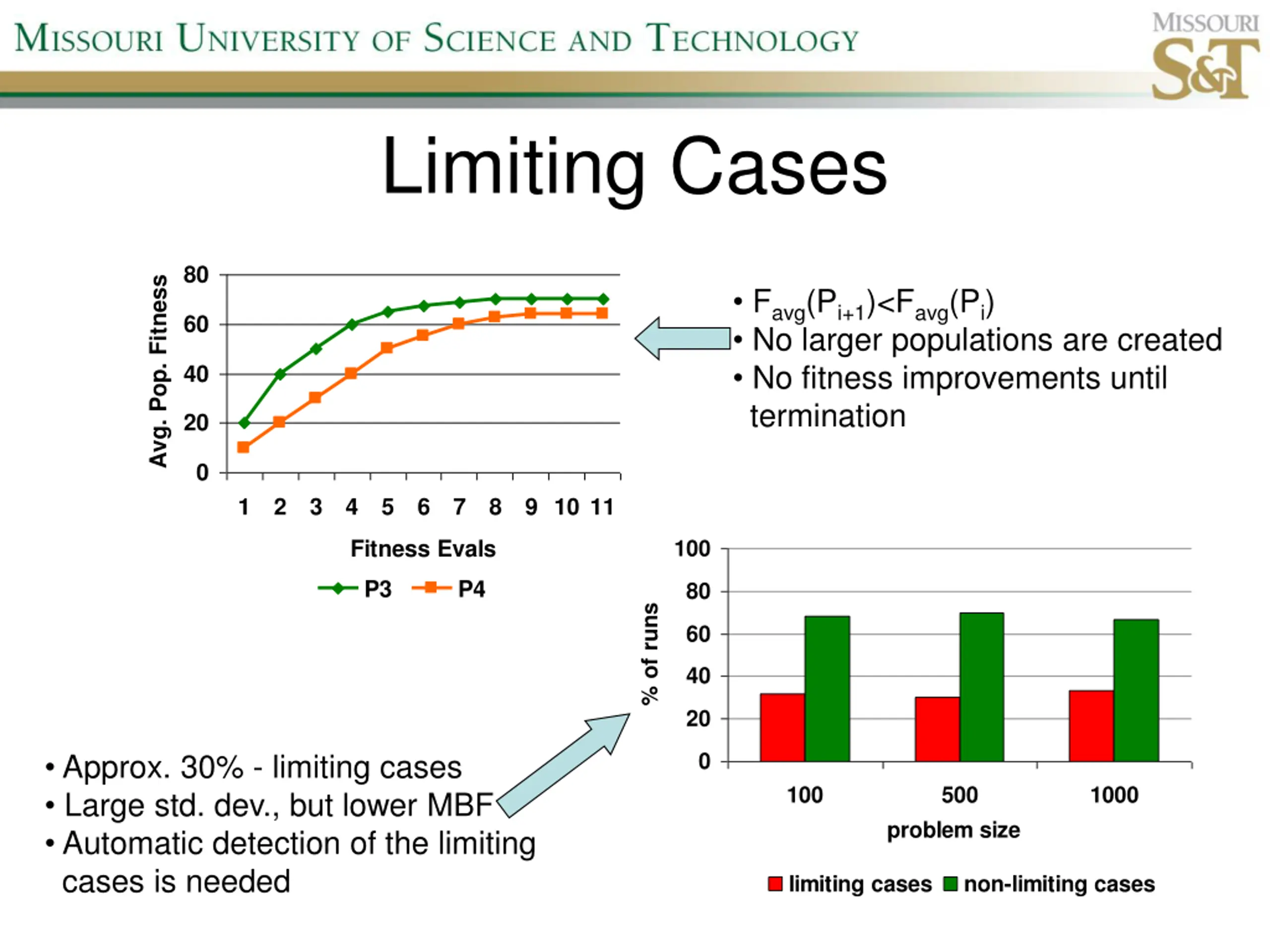 Limiting Cases 80 Avg. Pop. Fitness Favg(Pi+1)<Favg(Pi) No larger populations are created No fitness improvements until termination 60 40 20 0 1 2 3 4 5 6 7 8 9 10 11 Fitness Evals 100 P3 P4 80 % of runs 60 40 20 0 Approx. 30% - limiting cases Large std. dev., but lower MBF Automatic detection of the limiting cases is needed 100 500 1000 problem size limiting cases non-limiting cases