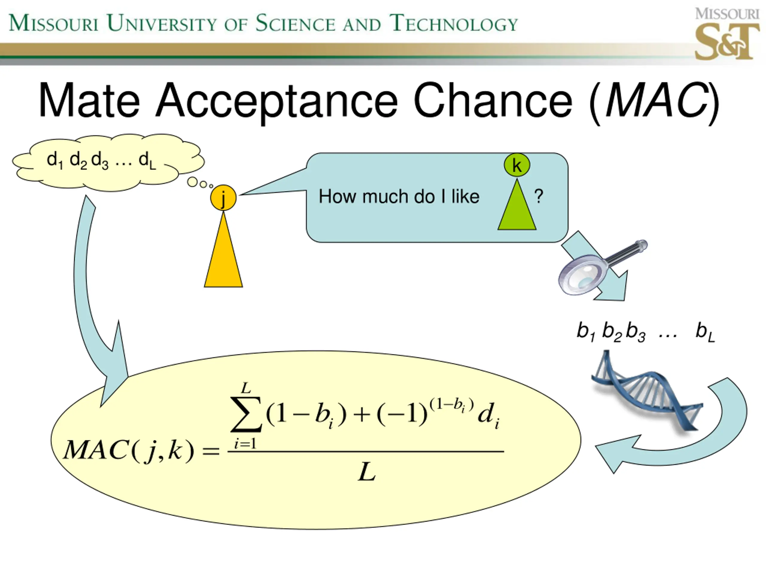Mate Acceptance Chance (MAC) d1 d2 d3 dL k How much do I like ? j b1 b2 b3 bL L = ( 1) + (1 ) b (1 ) b d i i i = ( , ) MAC j k 1 i L