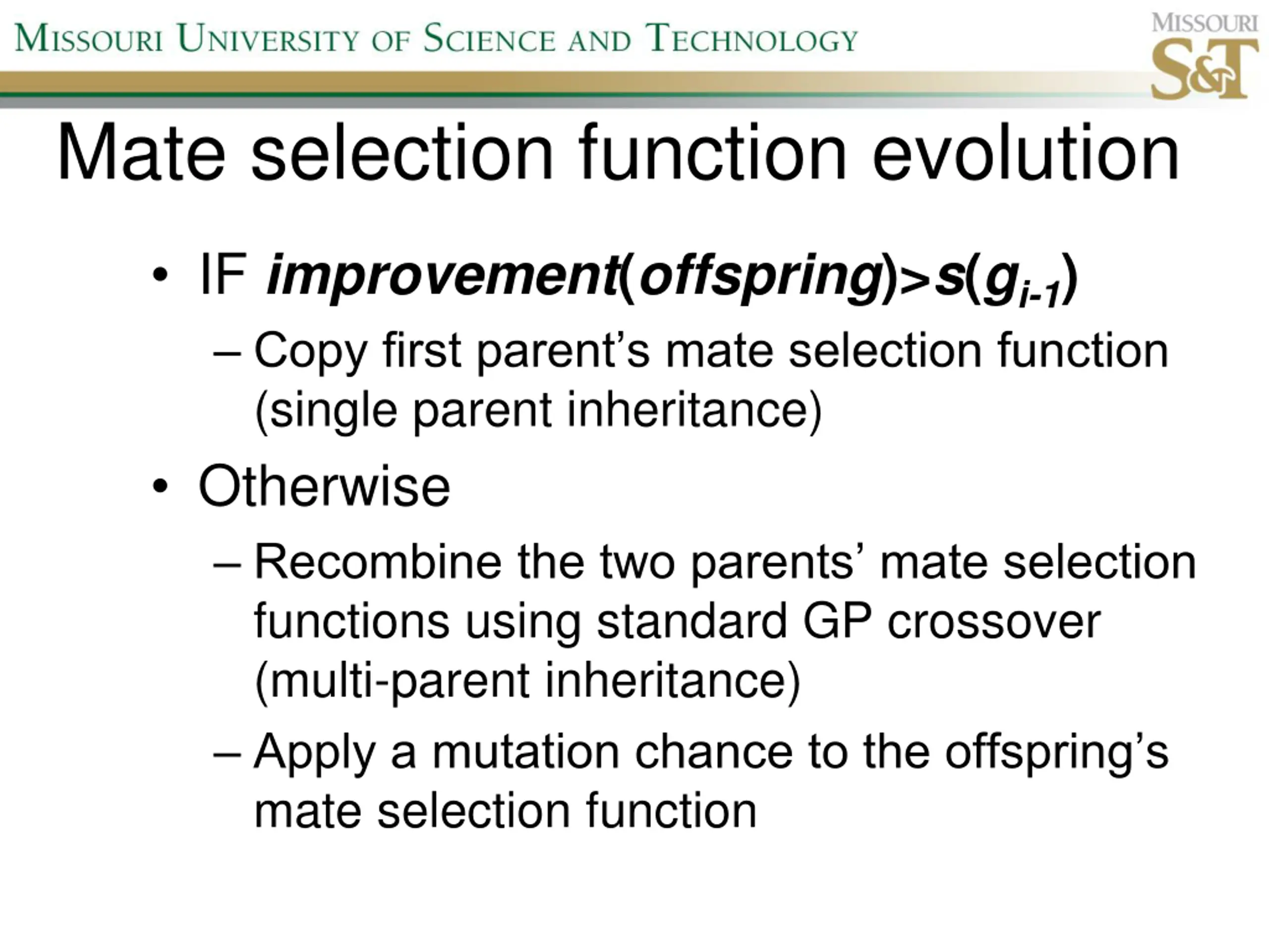 Mate selection function evolution IF improvement(offspring)>s(gi-1) Copy first parent s mate selection function (single parent inheritance) Otherwise Recombine the two parents mate selection functions using standard GP crossover (multi-parent inheritance) Apply a mutation chance to the offspring s mate selection function