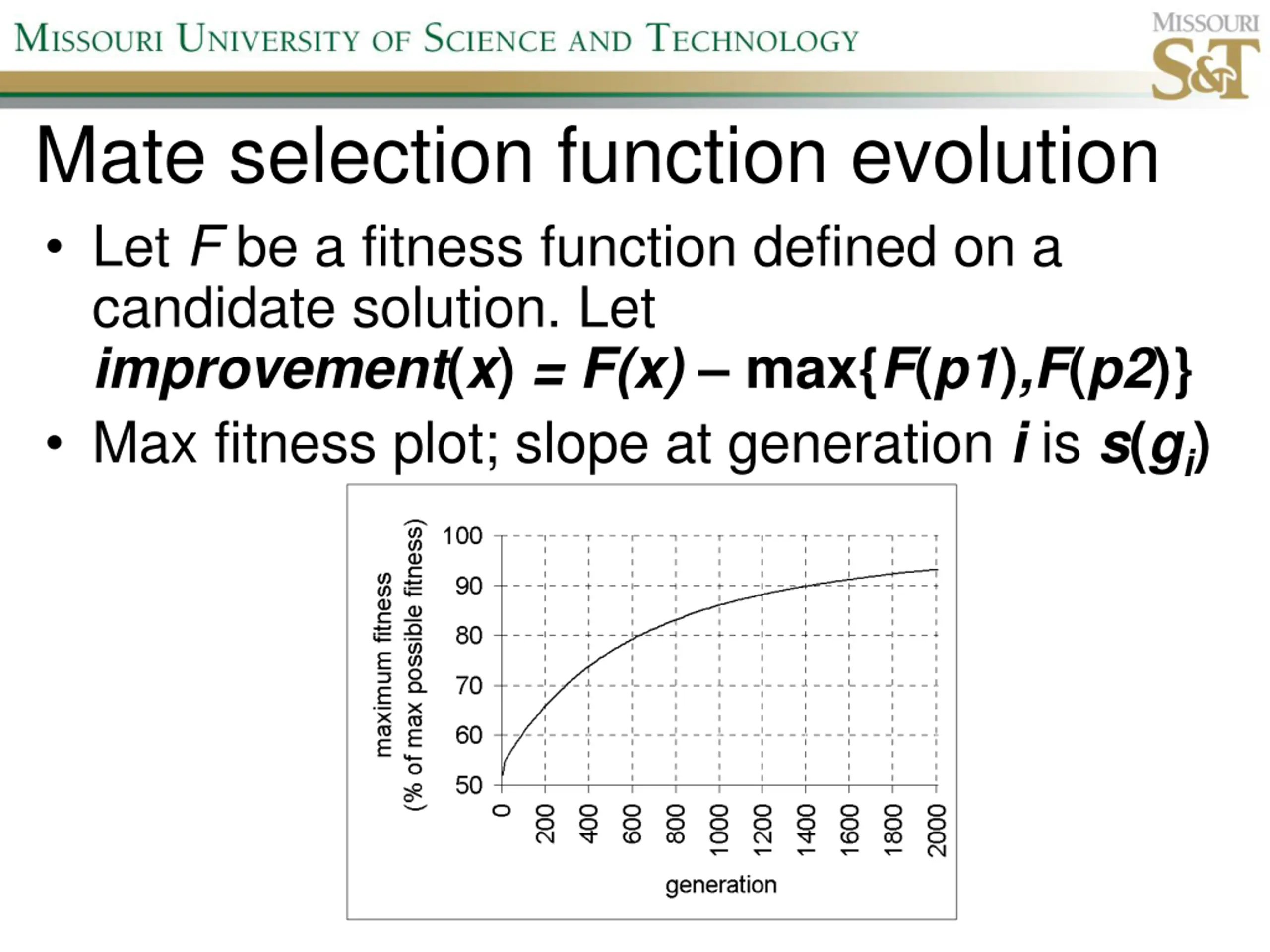 Mate selection function evolution Let F be a fitness function defined on a candidate solution. Let improvement(x) = F(x) max{F(p1),F(p2)} Max fitness plot; slope at generation i is s(gi)