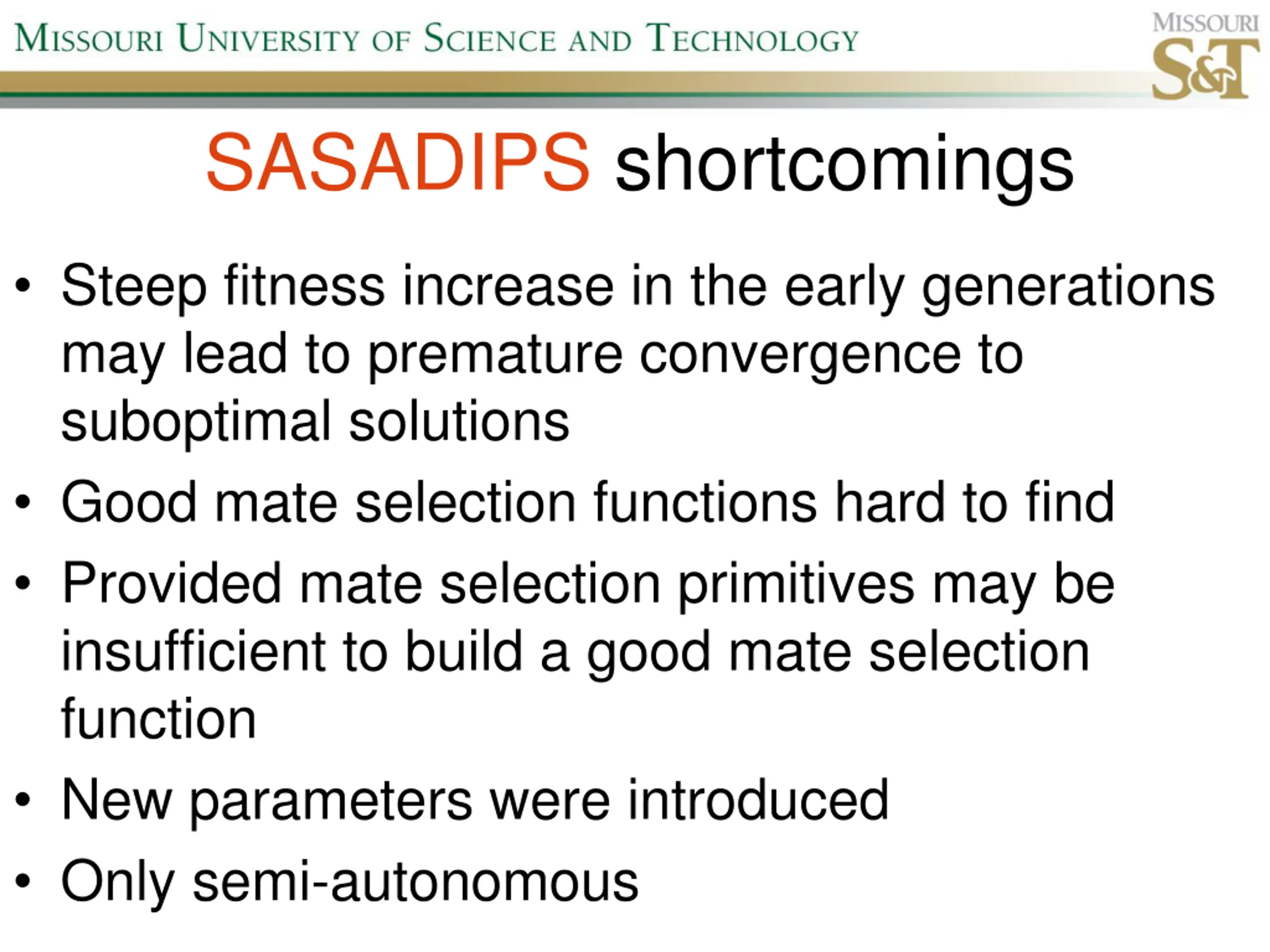 SASADIPS shortcomings Steep fitness increase in the early generations may lead to premature convergence to suboptimal solutions Good mate selection functions hard to find Provided mate selection primitives may be insufficient to build a good mate selection function New parameters were introduced Only semi-autonomous