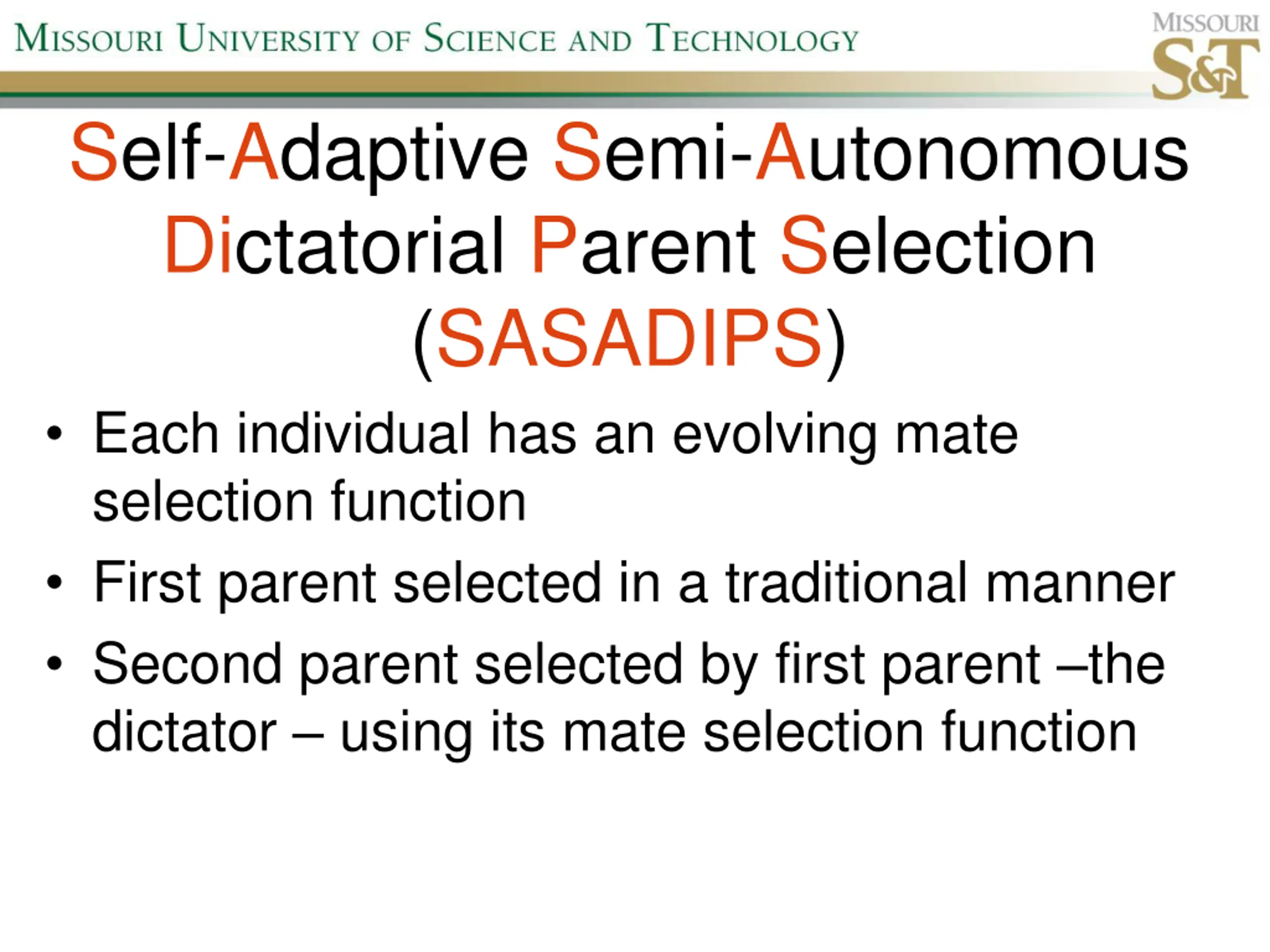 Self-Adaptive Semi-Autonomous Dictatorial Parent Selection (SASADIPS) Each individual has an evolving mate selection function First parent selected in a traditional manner Second parent selected by first parent the dictator using its mate selection function