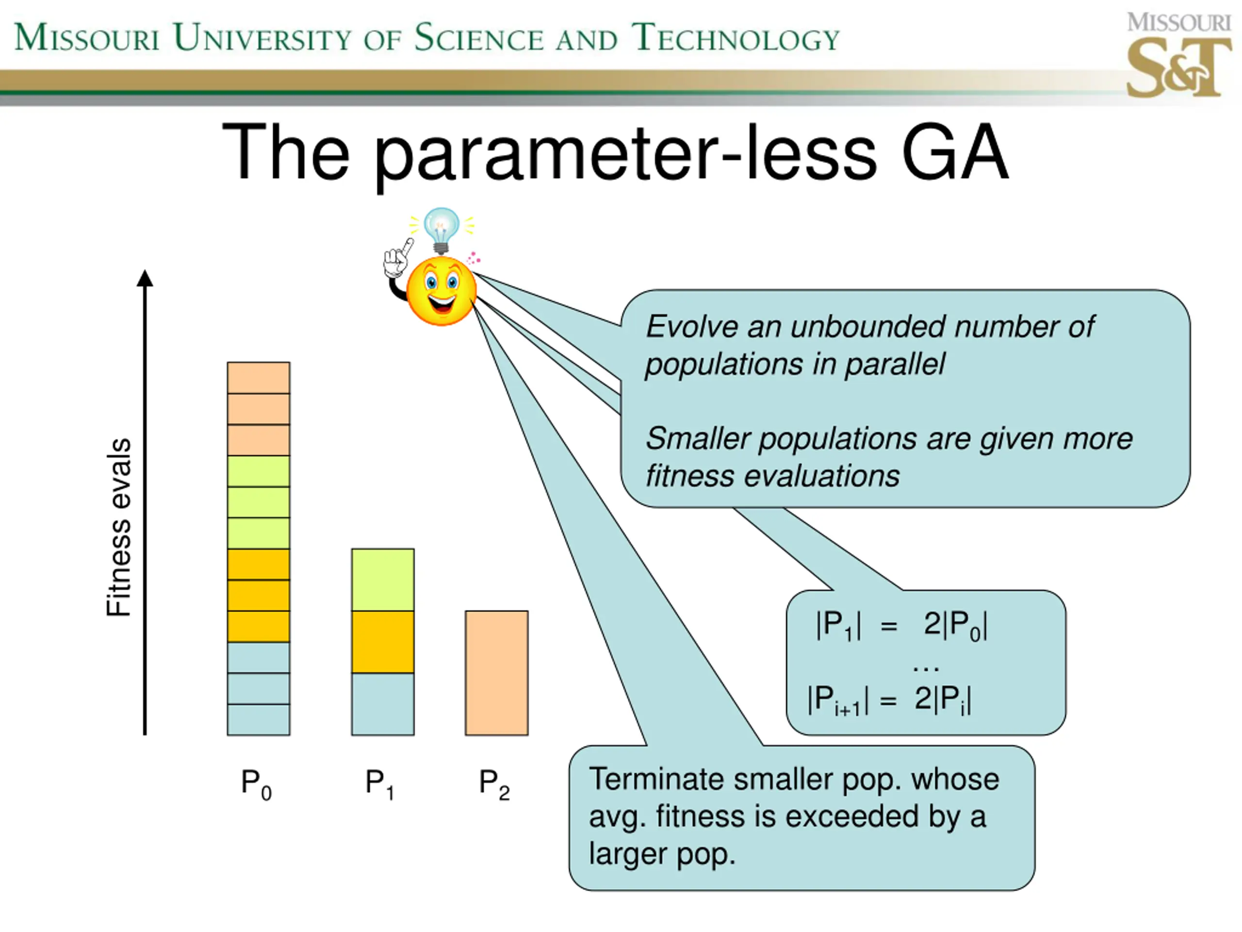 The parameter-less GA Evolve an unbounded number of populations in parallel Smaller populations are given more fitness evaluations Fitness evals |P1| = 2|P0| |Pi+1| = 2|Pi| Terminate smaller pop. whose avg. fitness is exceeded by a larger pop. P0 P1 P2