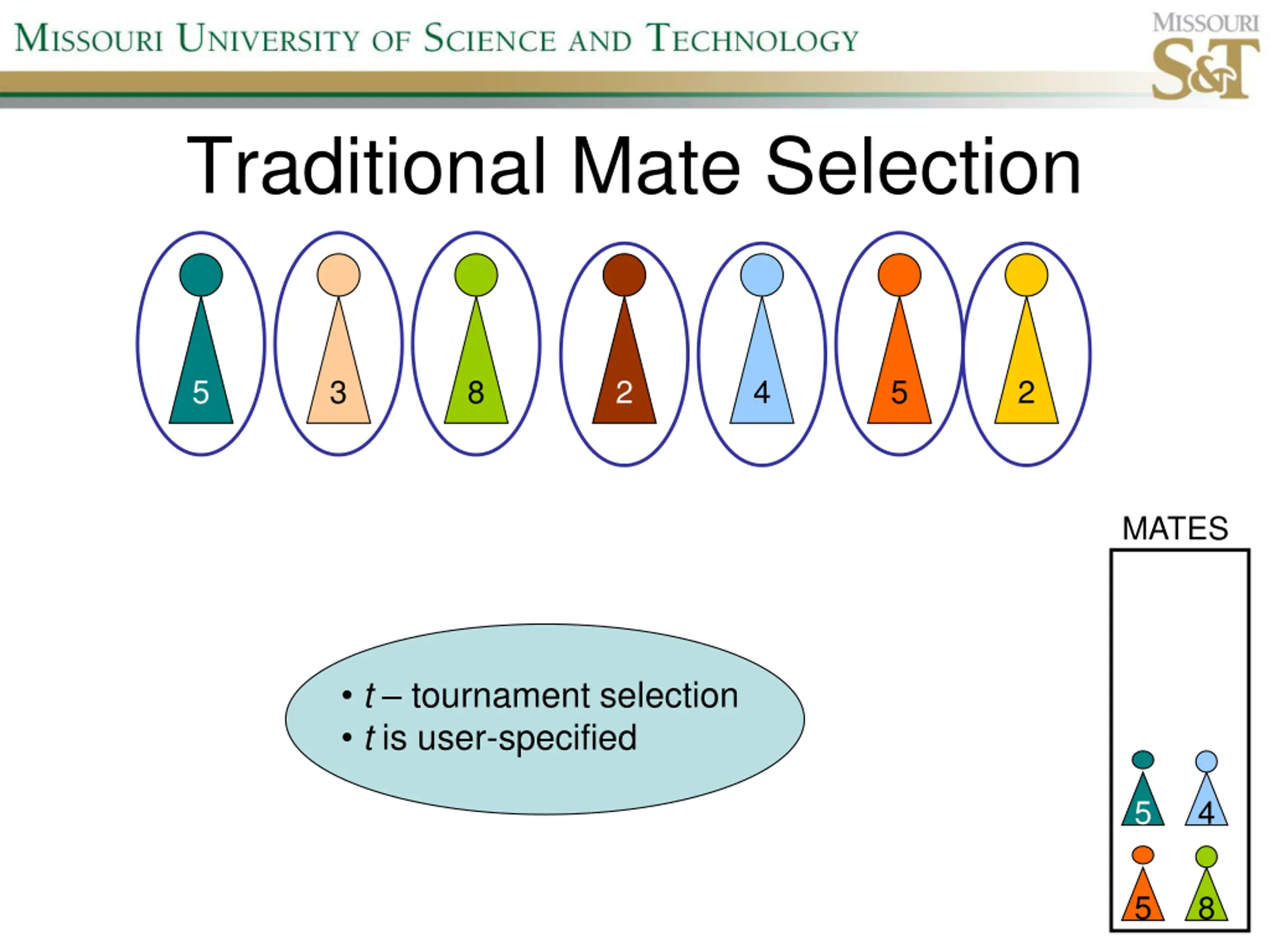 Traditional Mate Selection 5 3 8 2 4 5 2 MATES t tournament selection t is user-specified 5 4 5 8