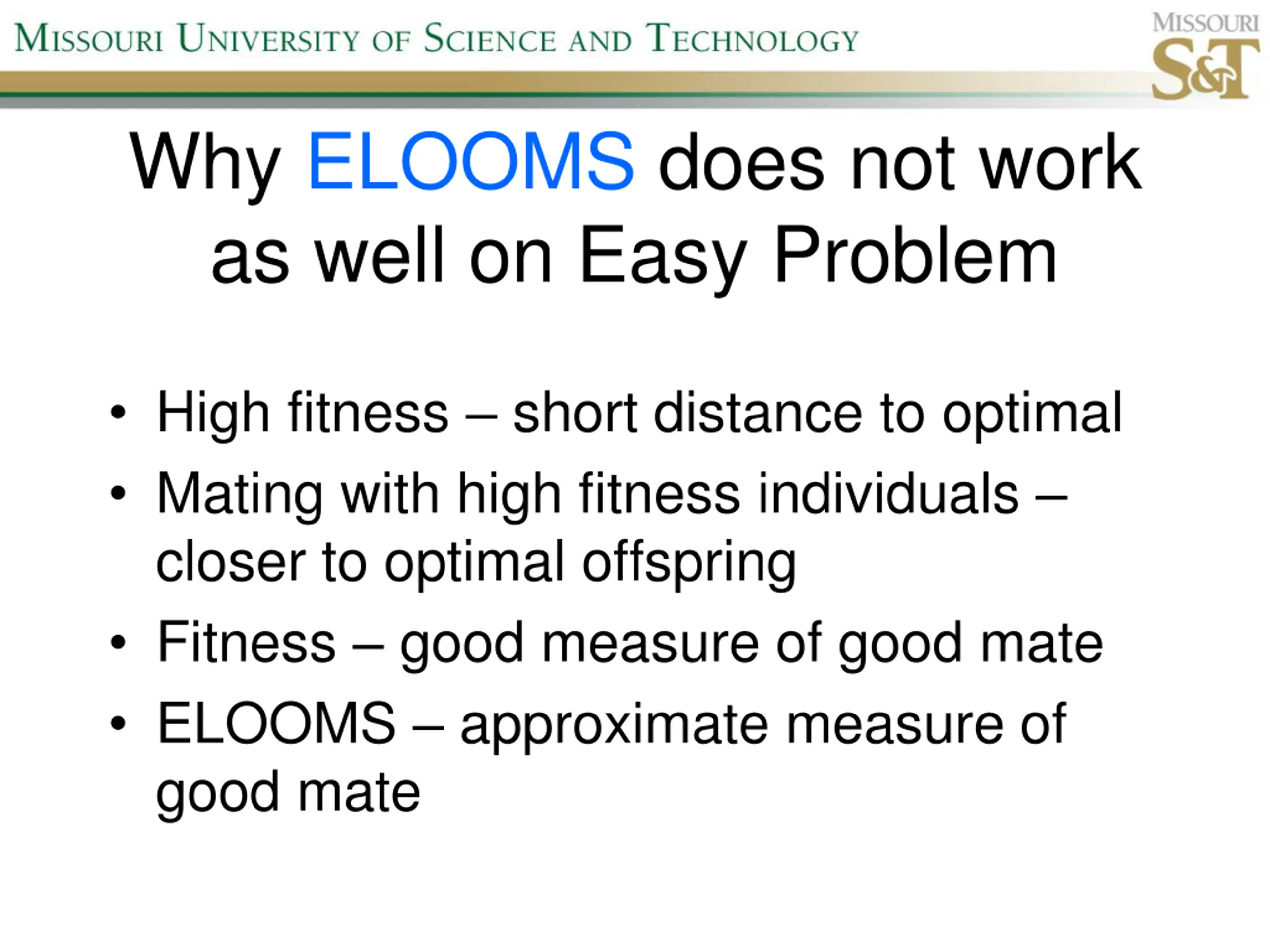 Why ELOOMS does not work as well on Easy Problem High fitness short distance to optimal Mating with high fitness individuals closer to optimal offspring Fitness good measure of good mate ELOOMS approximate measure of good mate