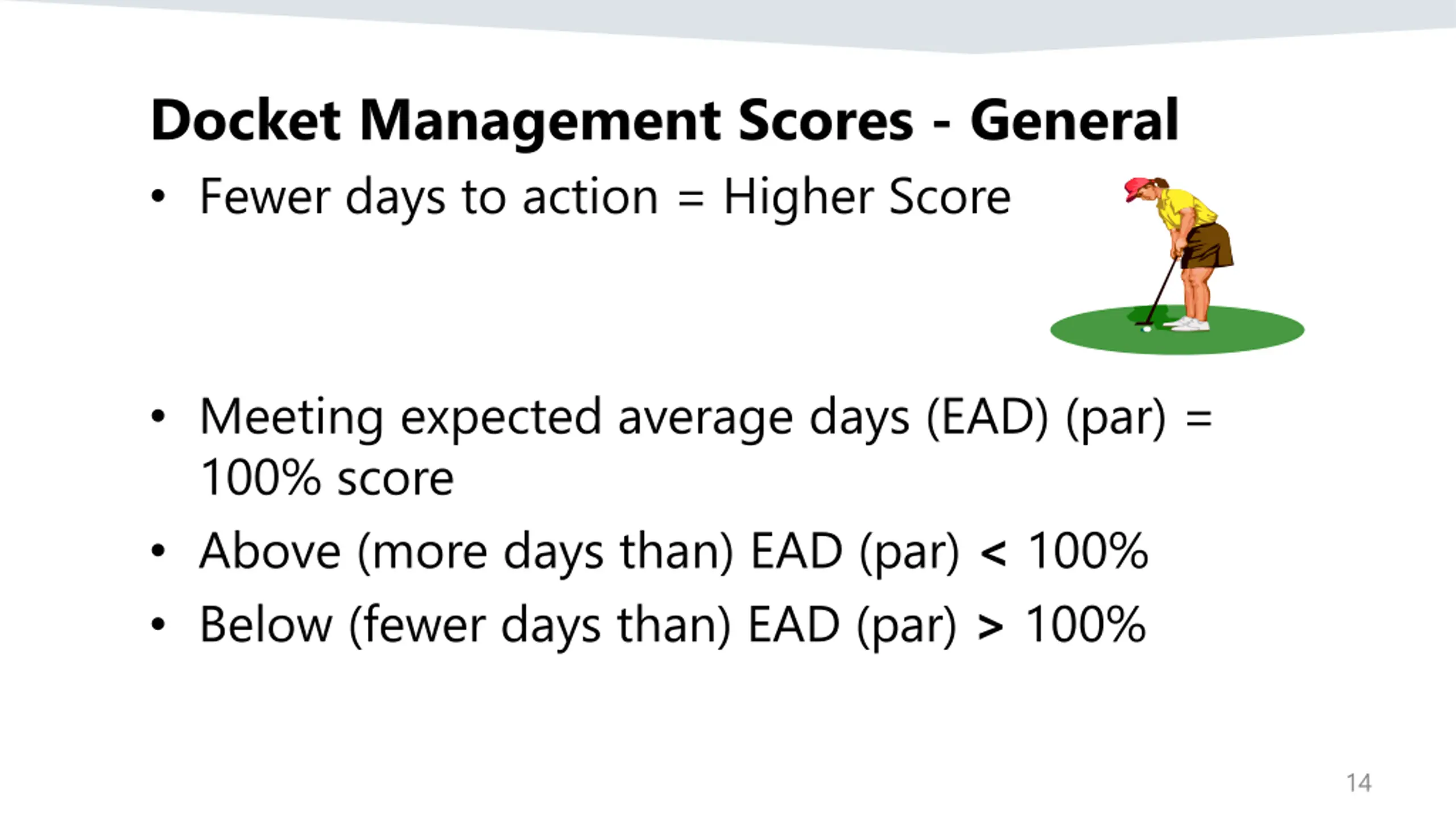 Docket Management Scores - General Fewer days to action = Higher Score Meeting expected average days (EAD) (par) = 100% score Above (more days than) EAD (par) < 100% Below (fewer days than) EAD (par) > 100% 14