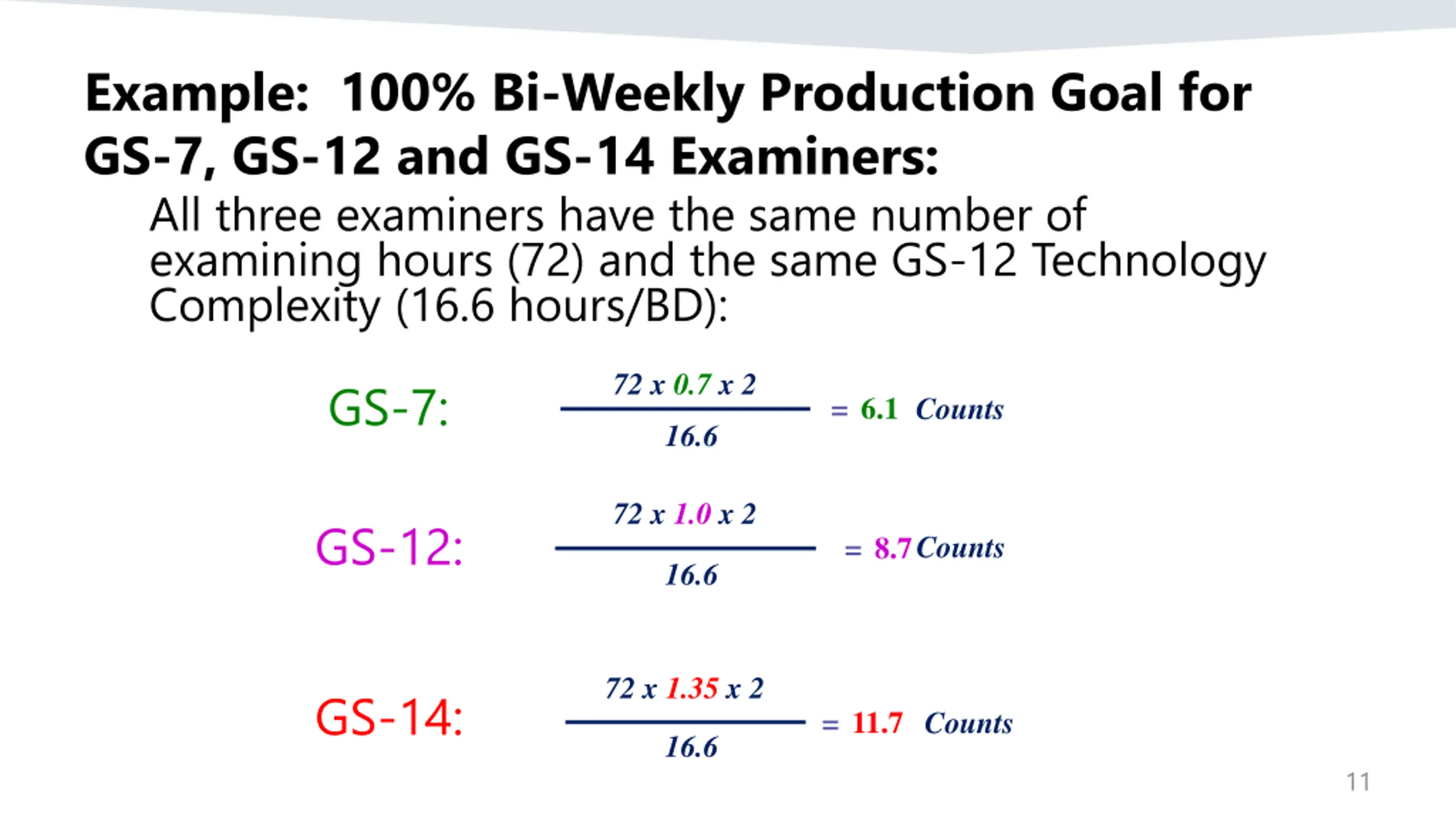 Example: 100% Bi-Weekly Production Goal for GS-7, GS-12 and GS-14 Examiners: All three examiners have the same number of examining hours (72) and the same GS-12 Technology Complexity (16.6 hours/BD): 72 x 0.7 x 2 GS-7: = 6.1 Counts 16.6 72 x 1.0 x 2 GS-12: = 8.7Counts 16.6 72 x 1.35 x 2 GS-14: = 11.7 Counts 16.6 11