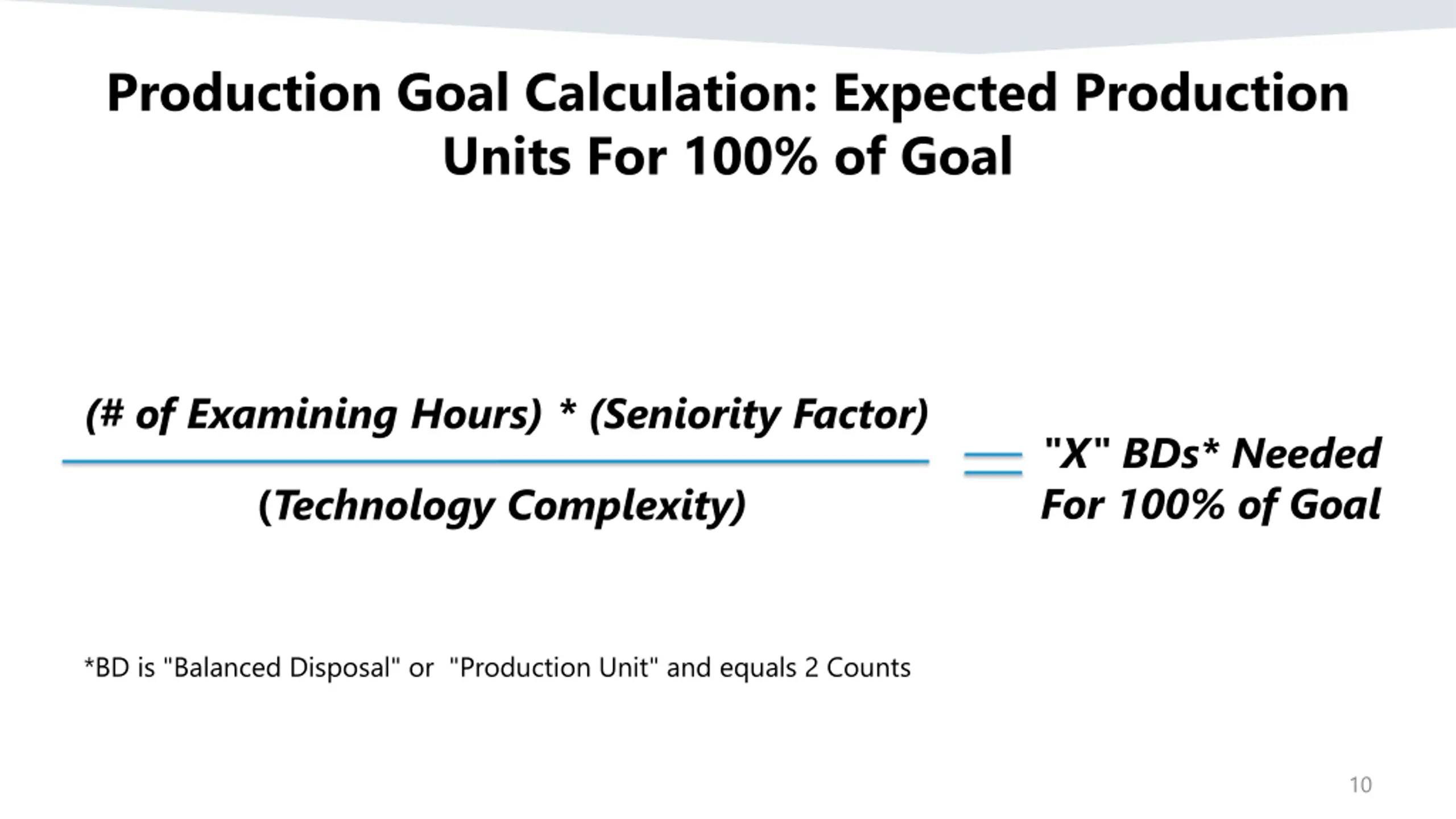 Production Goal Calculation: Expected Production Units For 100% of Goal (# of Examining Hours) * (Seniority Factor) "X" BDs* Needed For 100% of Goal (Technology Complexity) *BD is "Balanced Disposal" or "Production Unit" and equals 2 Counts 10