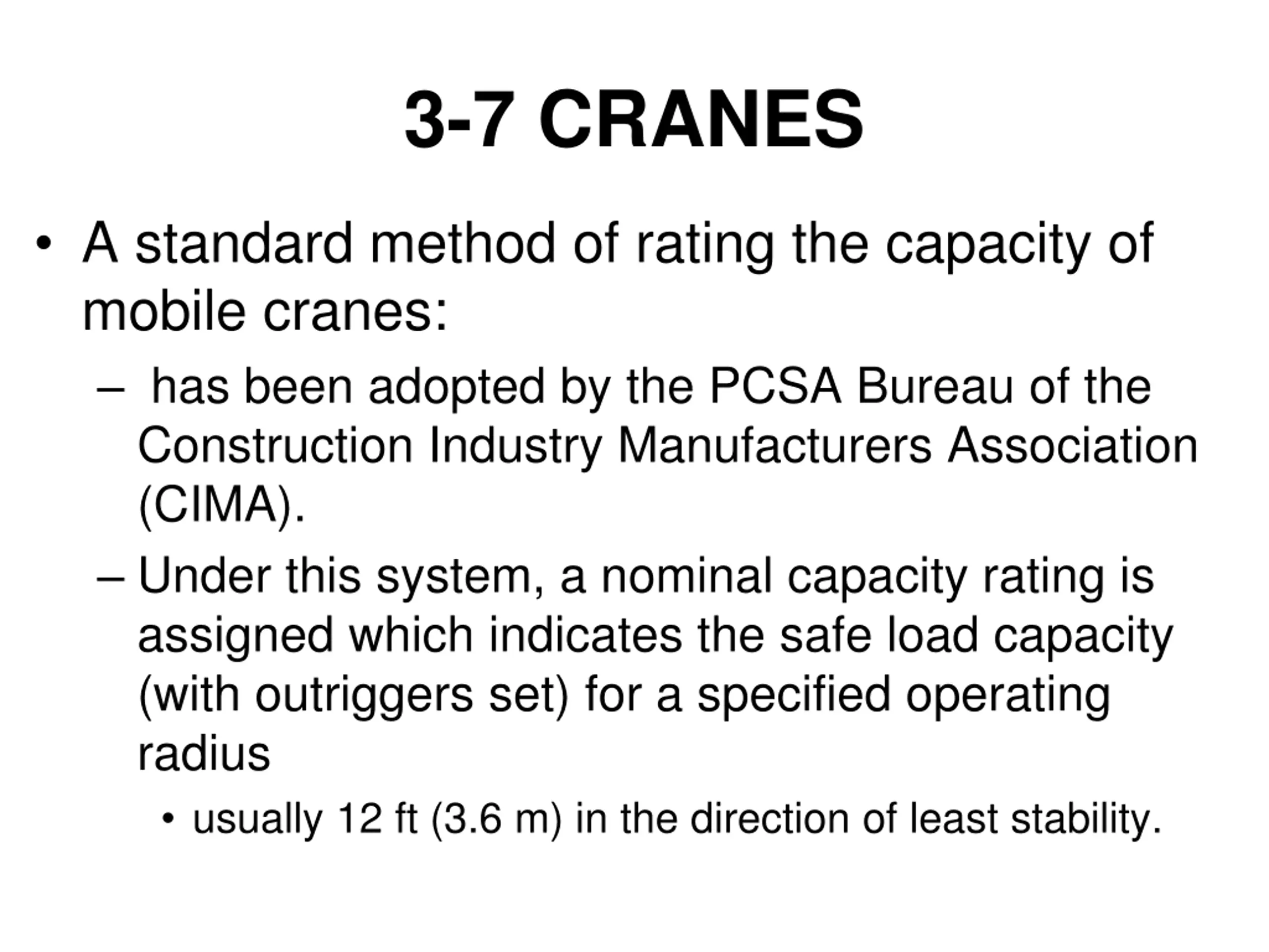 3-7 CRANES A standard method of rating the capacity of mobile cranes: has been adopted by the PCSA Bureau of the Construction Industry Manufacturers Association (CIMA). Under this system, a nominal capacity rating is assigned which indicates the safe load capacity (with outriggers set) for a specified operating radius usually 12 ft (3.6 m) in the direction of least stability.