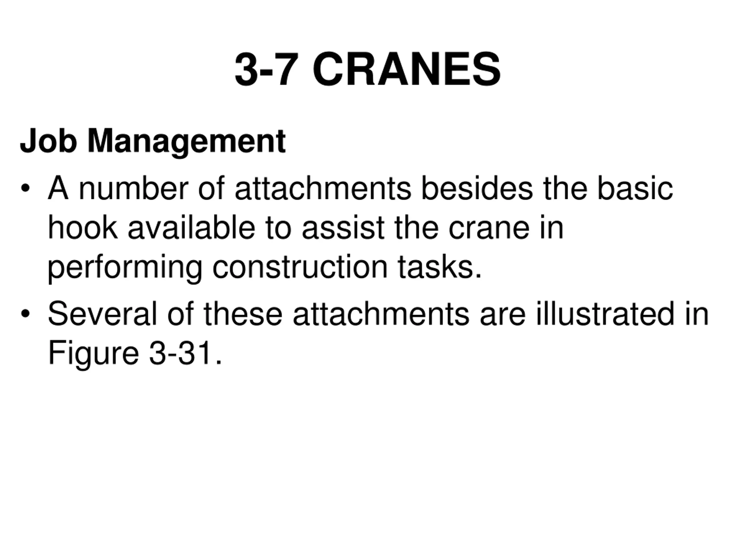 3-7 CRANES Job Management A number of attachments besides the basic hook available to assist the crane in performing construction tasks. Several of these attachments are illustrated in Figure 3-31.